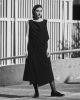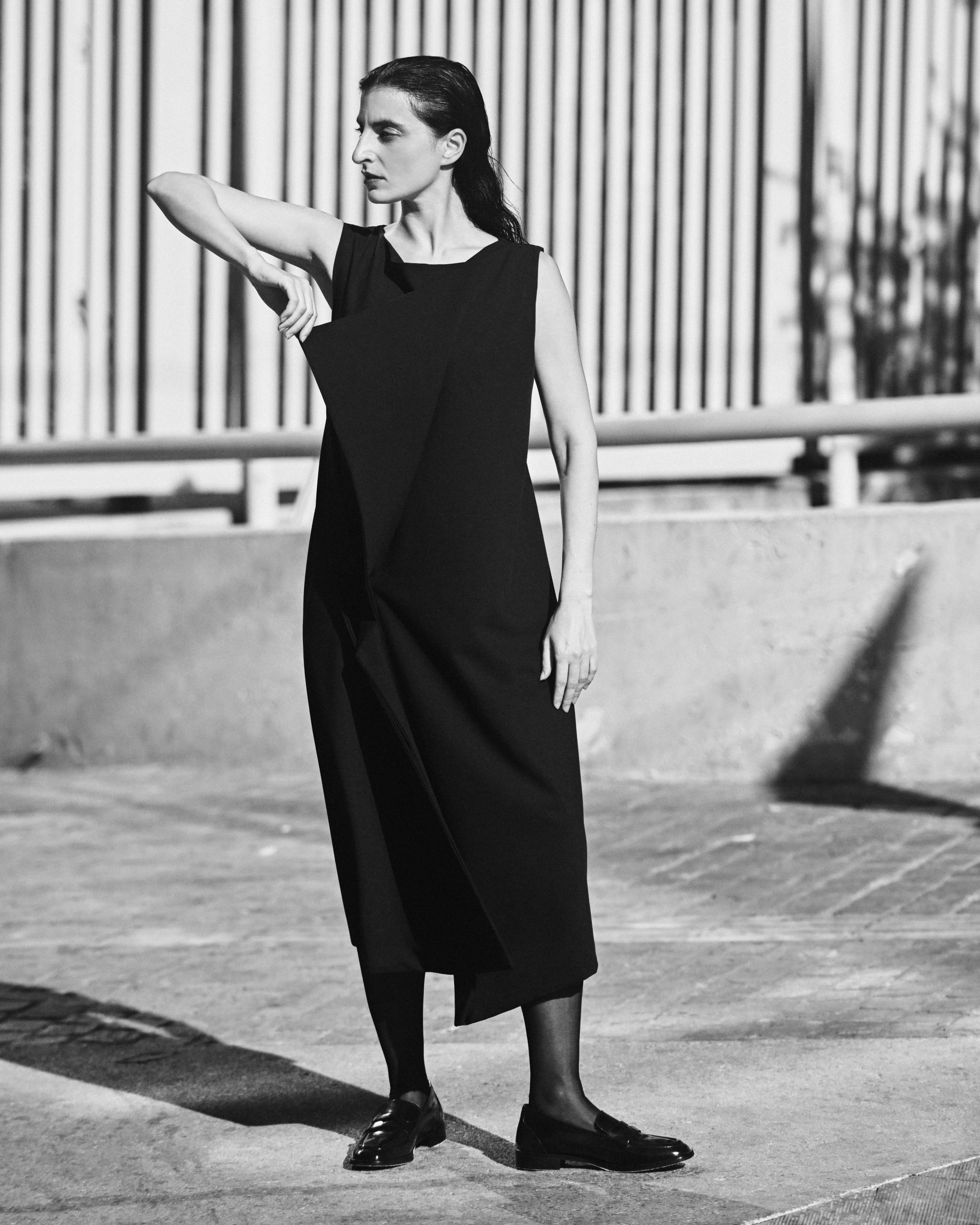 Αμάνικο μαύρο μίντι φόρεμα σε γραμμή Α που ξεχωρίζει με τολμηρή, ασύμμετρη πιέτα που πέφτει εντυπωσιακά στο μπροστινό μέρος. Η ψηλή, στρογγυλή λαιμόκοψη και οι καθαρές γραμμές τονίζουν τη μοντέρνα αισθητική, ενώ το ύφασμα διατηρεί το σχήμα του, προσδίδοντας έναν σύγχρονο, εκλεπτυσμένο χαρακτήρα.