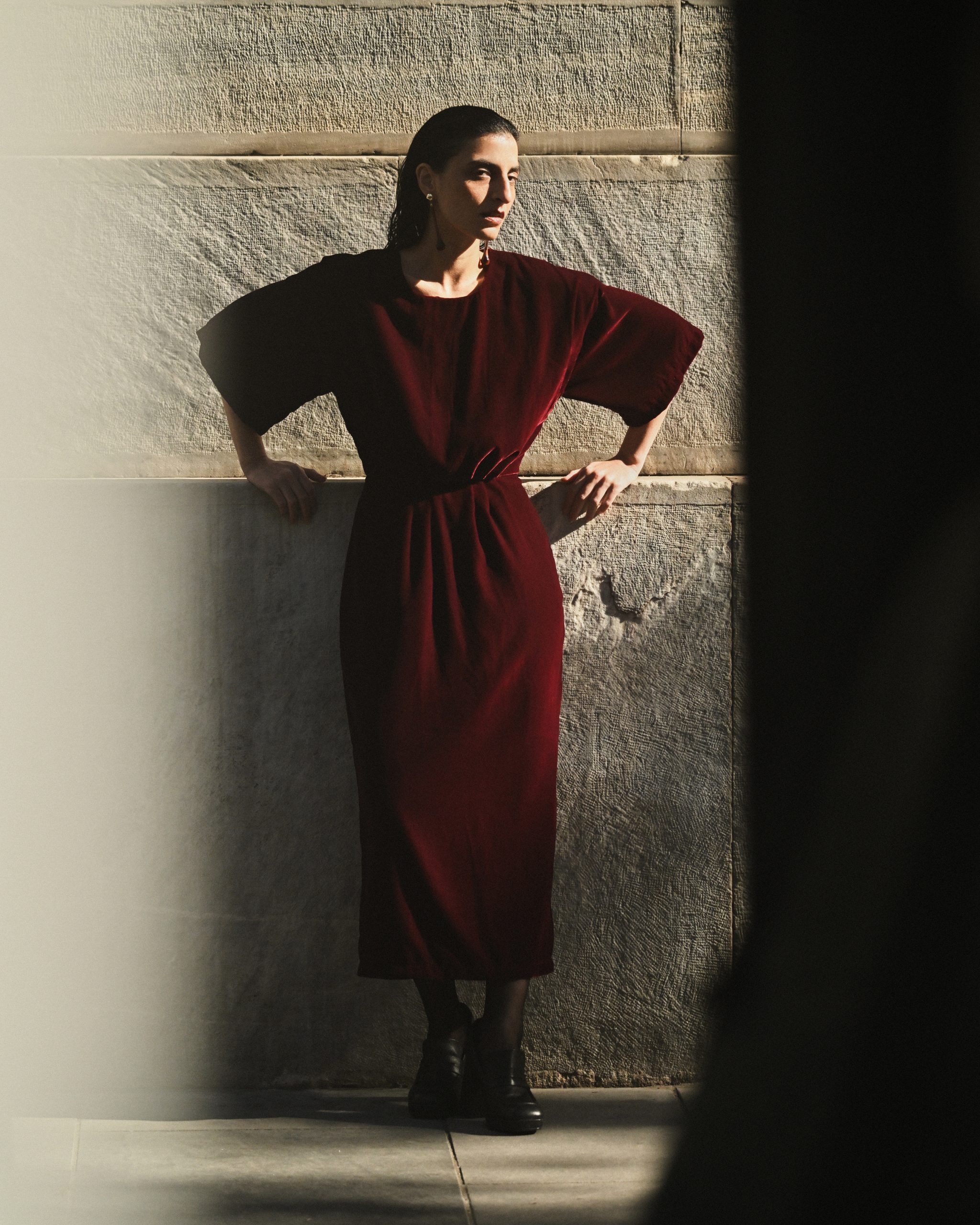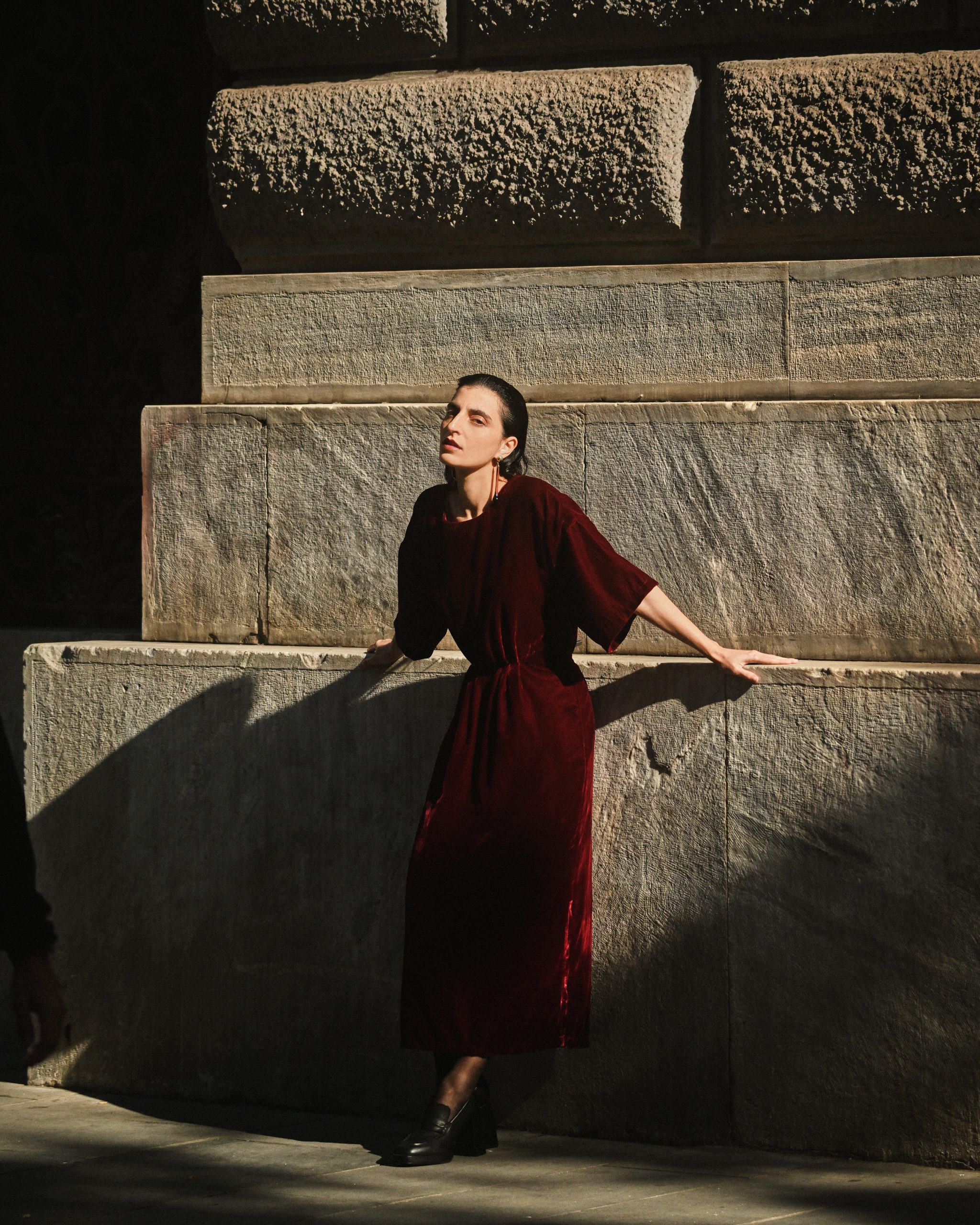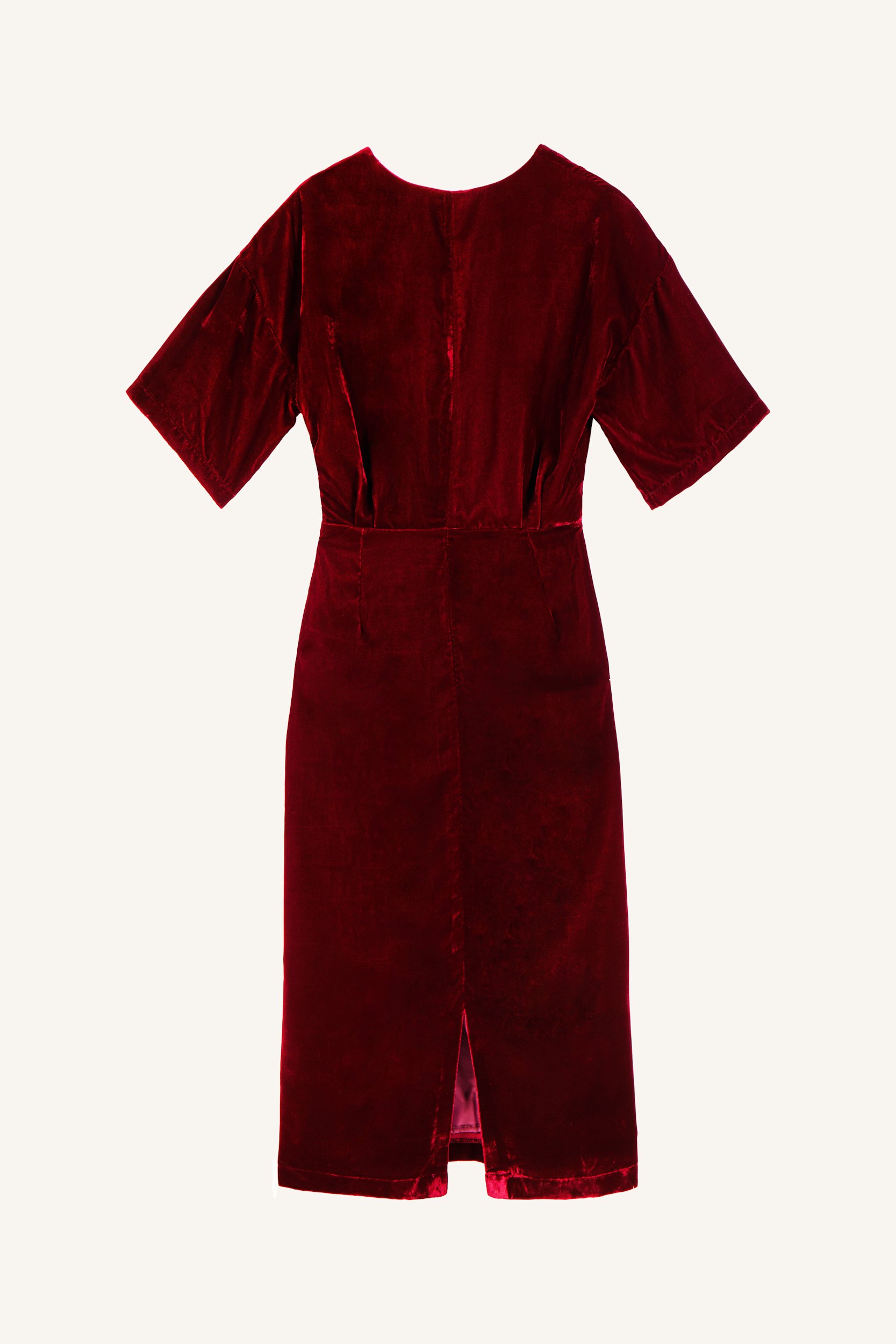 Απαραίτητο κομμάτι για κάθε γιορτινή γκαρνταρόμπα, μίντι φόρεμα κατασκευασμένο από premium βελούδο σε μπορντό απόχρωση. Σχεδιασμένο σε άνετη, μακριά γραμμή με διακριτική σούρα στη μέση για να αναδείξει τη γραμμή του σώματος, προσφέρει κομψότητα και κολακεύει. Οι ελαφρώς δομημένοι ώμοι, τα μανίκια τριών τετάρτων και η στρογγυλή λαιμόκοψη προσδίδουν μια διαχρονική αισθητική, ενώ η διακριτική γυαλάδα του υφάσματος αιχμαλωτίζει το φως, προσθέτοντας μια πινελιά λάμψης. Ιδανικό για βραδινές εμφανίσεις, αυτό το φόρεμα συνδυάζεται άψογα με γόβες και διακριτικά κοσμήματα, καθιστώντας το μια ευέλικτη επιλογή για τη γιορτινή περίοδο.