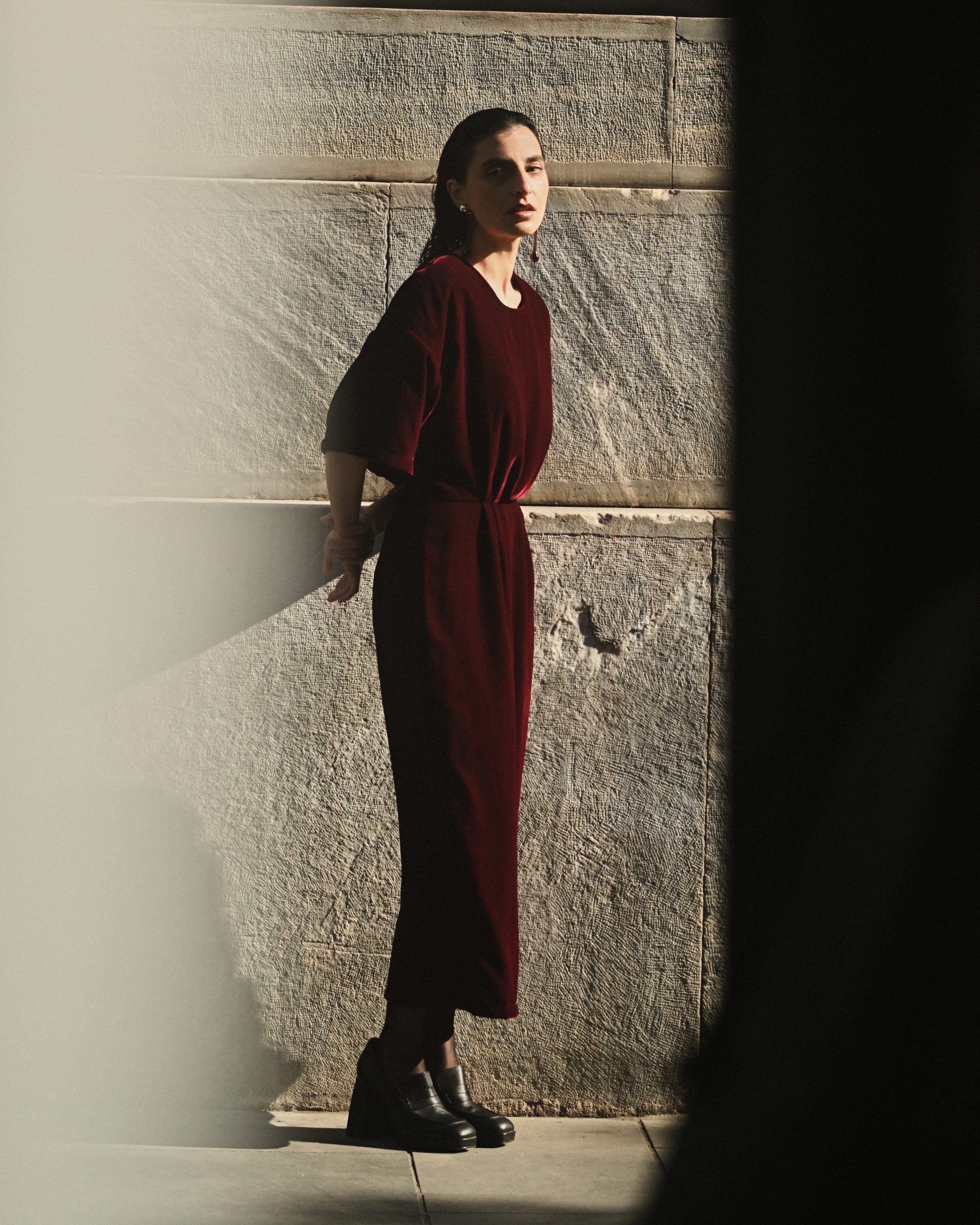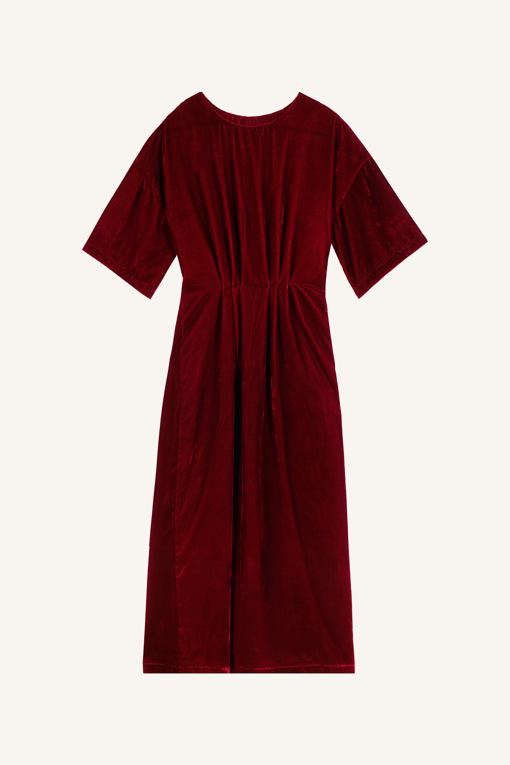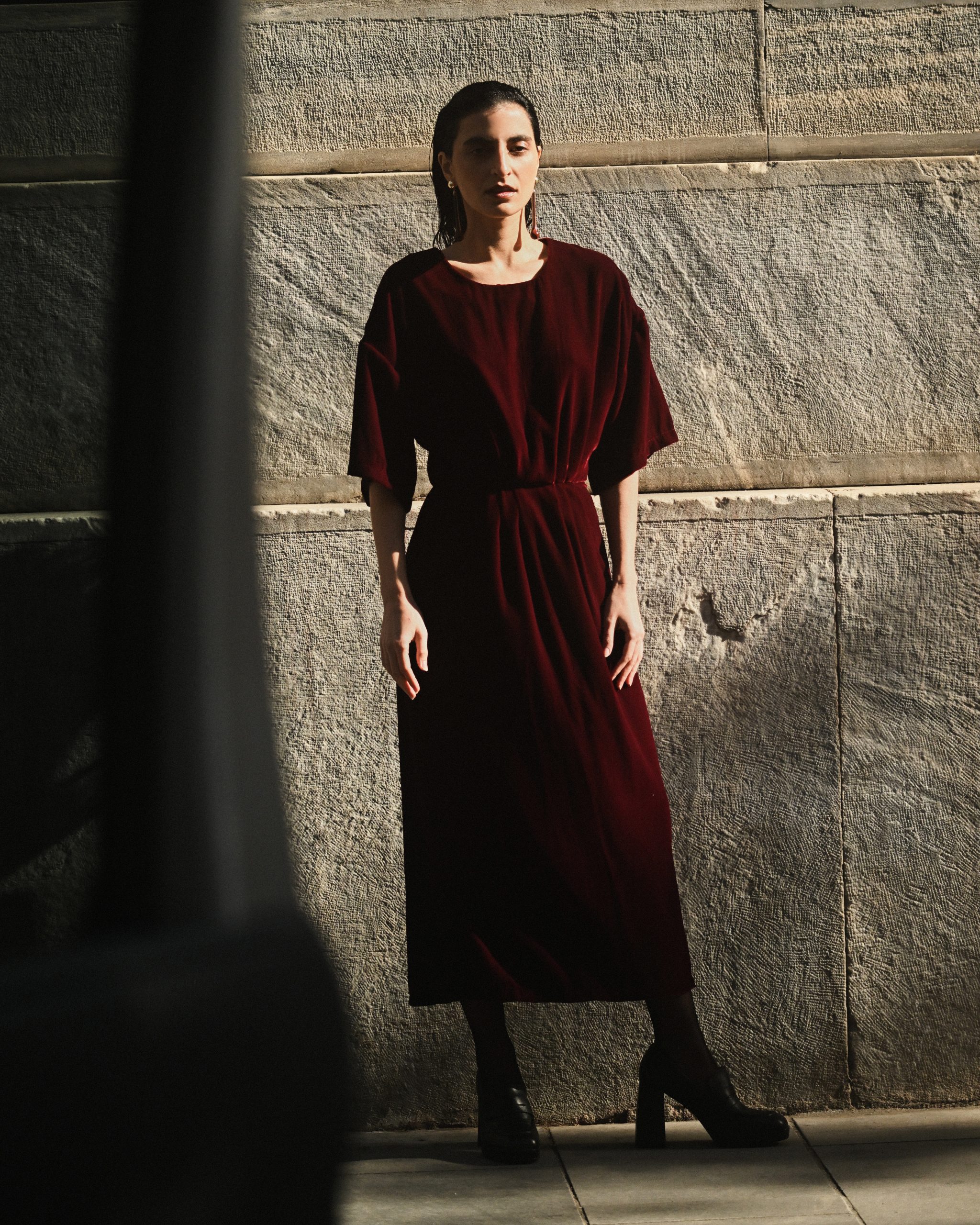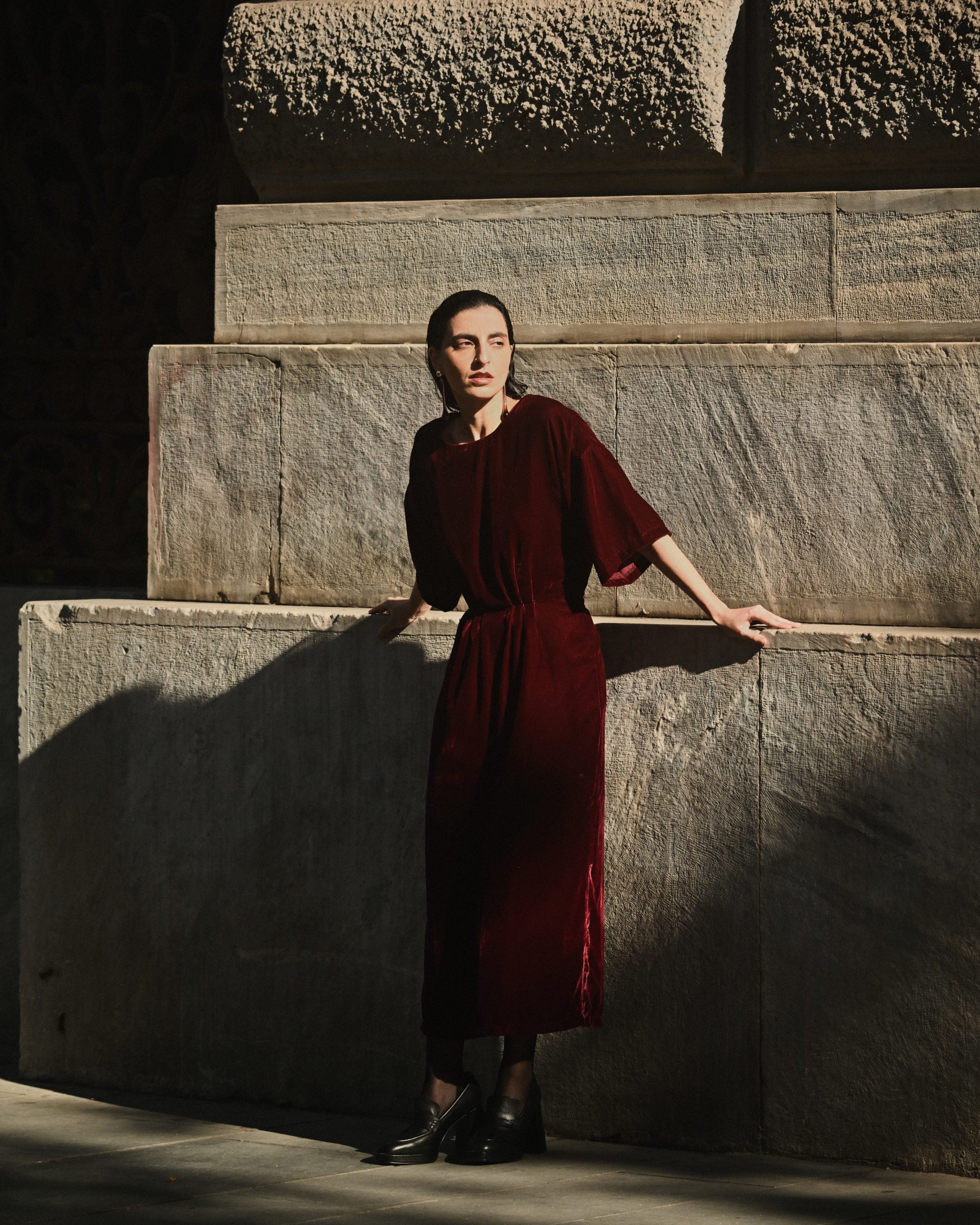 Απαραίτητο κομμάτι για κάθε γιορτινή γκαρνταρόμπα, μίντι φόρεμα κατασκευασμένο από premium βελούδο σε μπορντό απόχρωση. Σχεδιασμένο σε άνετη, μακριά γραμμή με διακριτική σούρα στη μέση για να αναδείξει τη γραμμή του σώματος, προσφέρει κομψότητα και κολακεύει. Οι ελαφρώς δομημένοι ώμοι, τα μανίκια τριών τετάρτων και η στρογγυλή λαιμόκοψη προσδίδουν μια διαχρονική αισθητική, ενώ η διακριτική γυαλάδα του υφάσματος αιχμαλωτίζει το φως, προσθέτοντας μια πινελιά λάμψης. Ιδανικό για βραδινές εμφανίσεις, αυτό το φόρεμα συνδυάζεται άψογα με γόβες και διακριτικά κοσμήματα, καθιστώντας το μια ευέλικτη επιλογή για τη γιορτινή περίοδο.