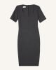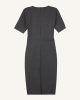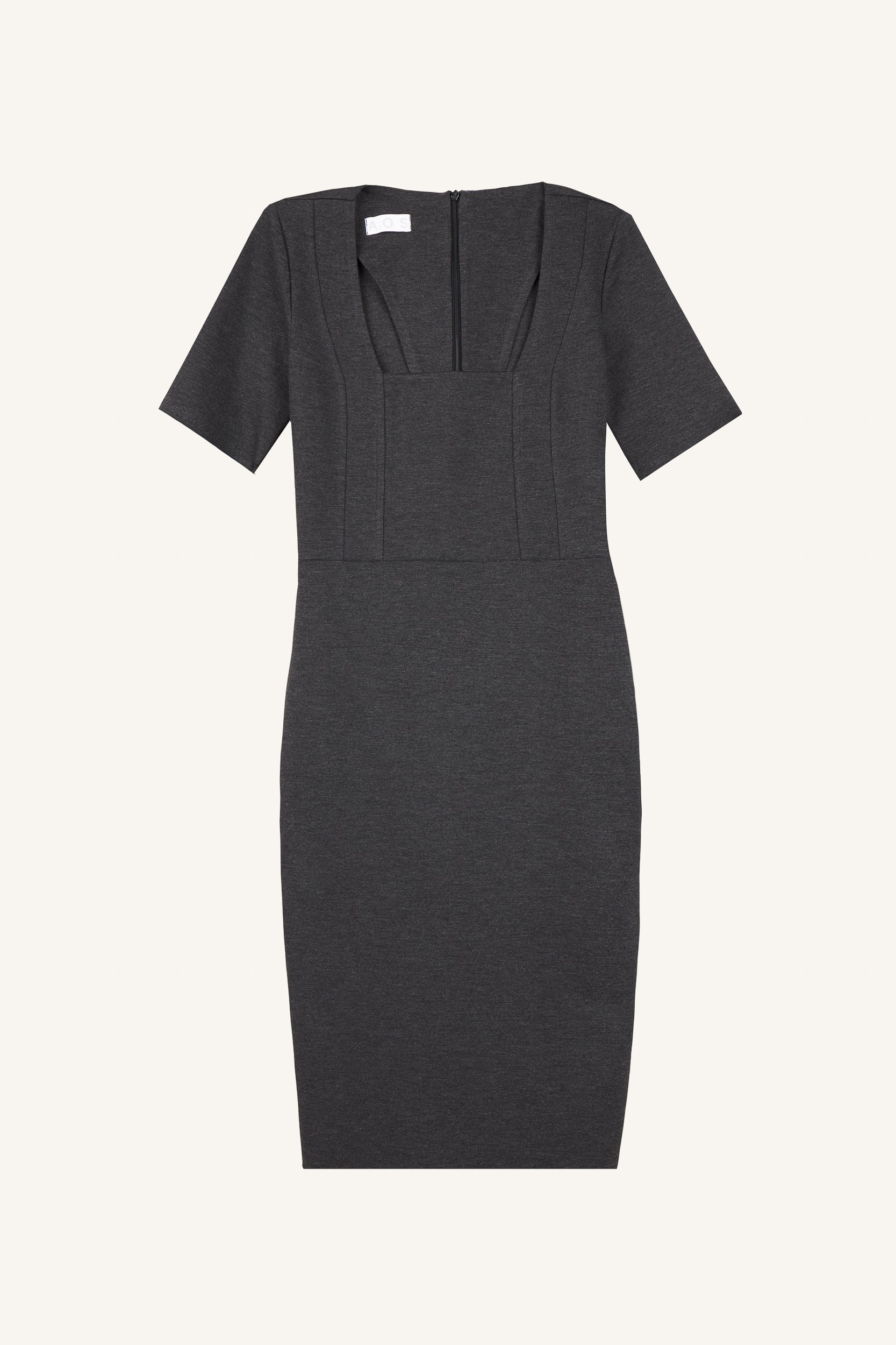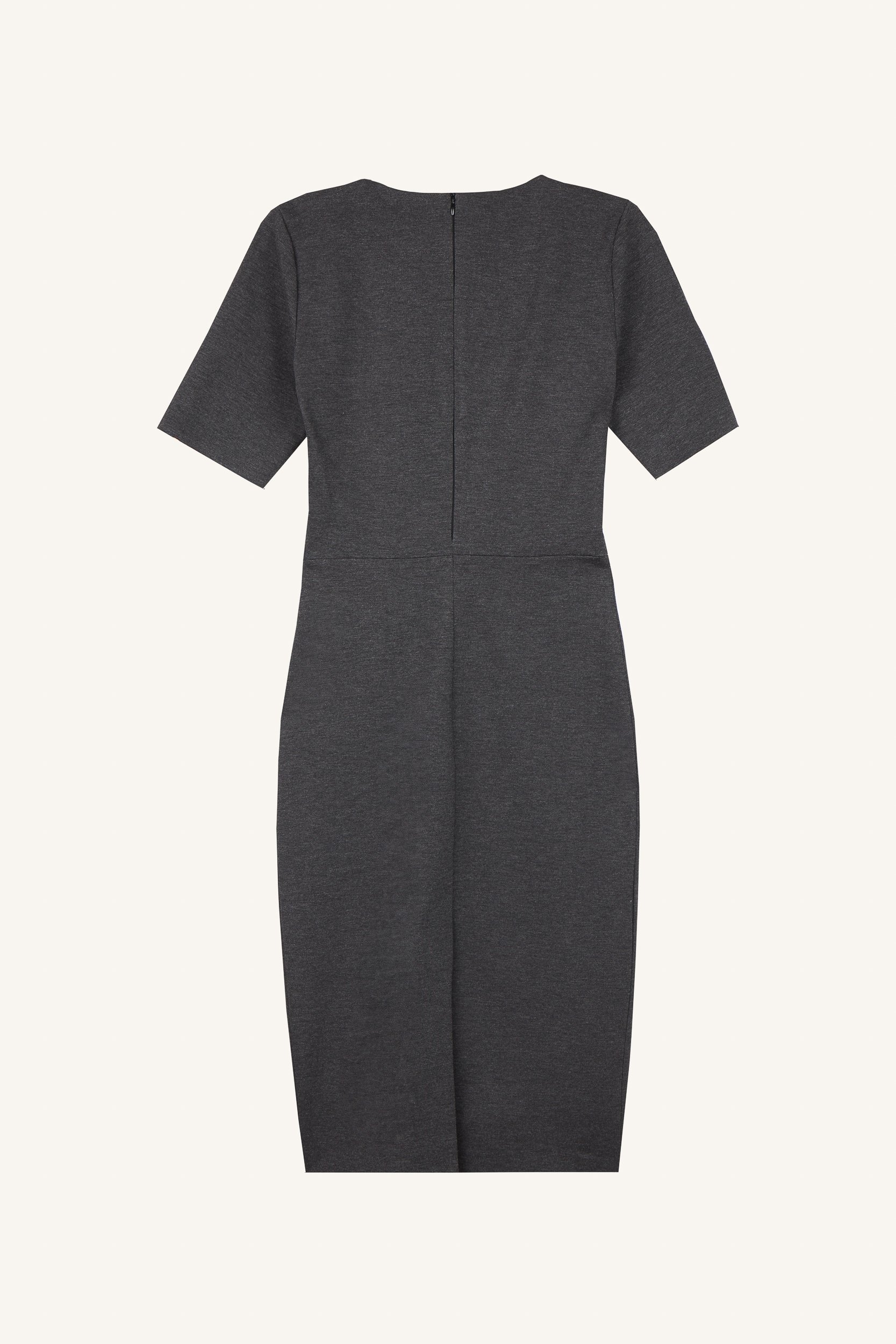 Εφαρμοστό γκρι μίντι φόρεμα, σχεδιασμένο από ποντοστόφα. Γνωστό για την εξαιρετική του ελαστικότητα και αντοχή, το ύφασμα προσφέρει εφαρμογή που αγκαλιάζει το σώμα, κολακεύοντας τη σιλουέτα σας ενώ παρέχει άνετη αίσθηση. Το φόρεμα διαθέτει κομψό φερμουάρ στο πίσω μέρος, εξασφαλίζοντας εύκολη εφαρμογή. Ένα εντυπωσιακό ανοιχτό V-ντεκολτέ προσθέτει γοητεία. Τα κοντά μανίκια προσφέρουν ισορροπία, καθιστώντας το φόρεμα κατάλληλο για επίσημες και για casual εμφανίσεις. Διατίθεται σε μαύρο και γκρι.