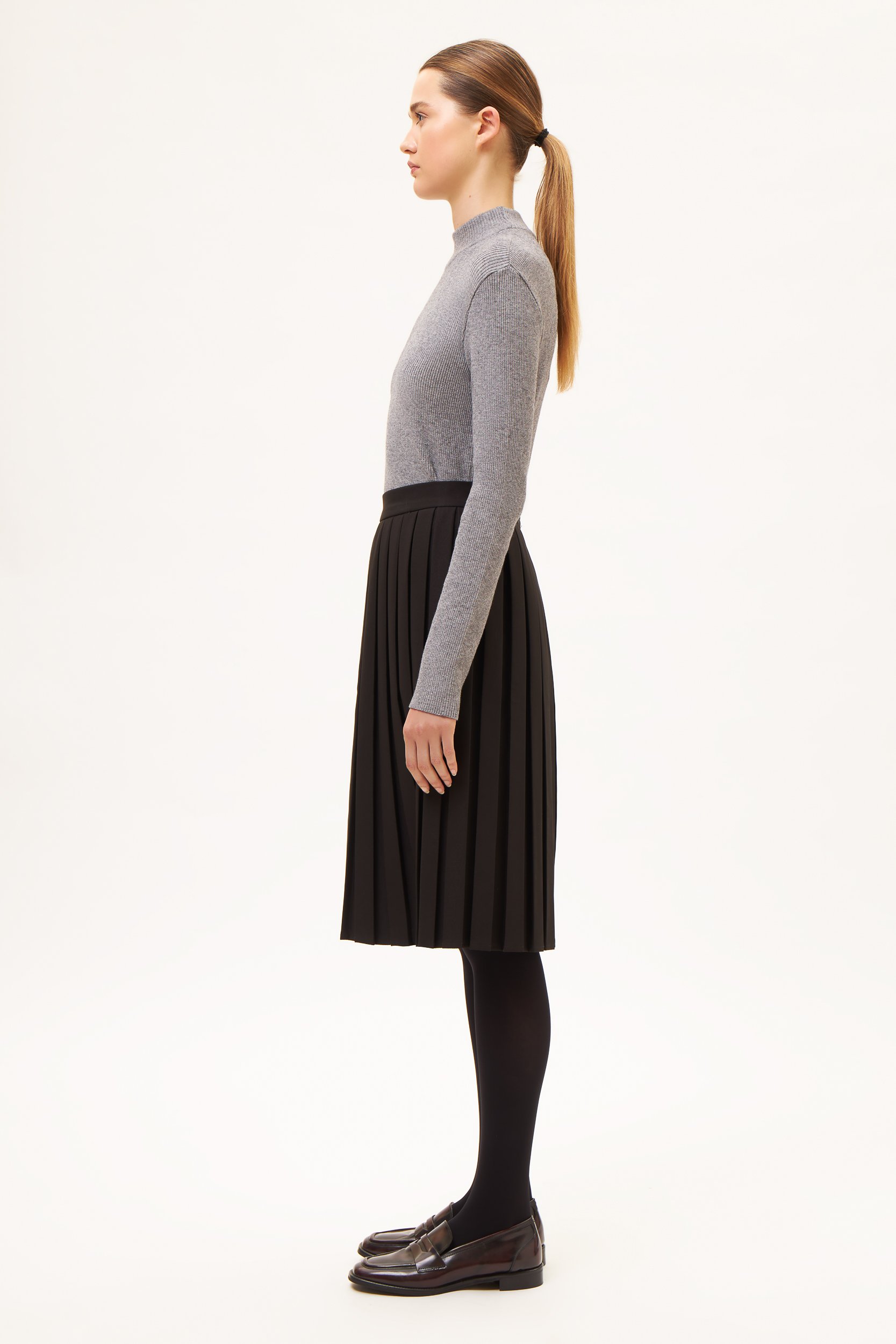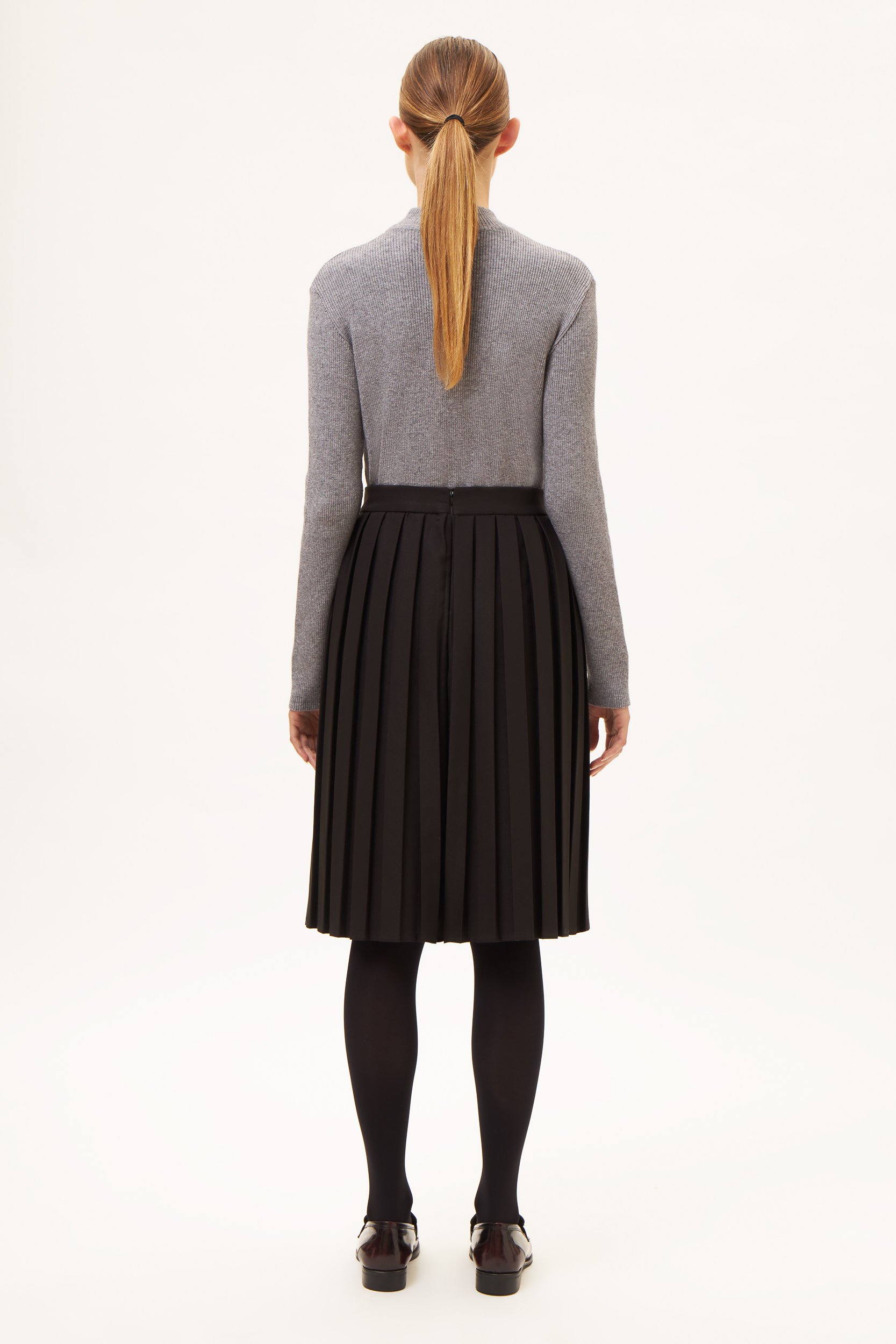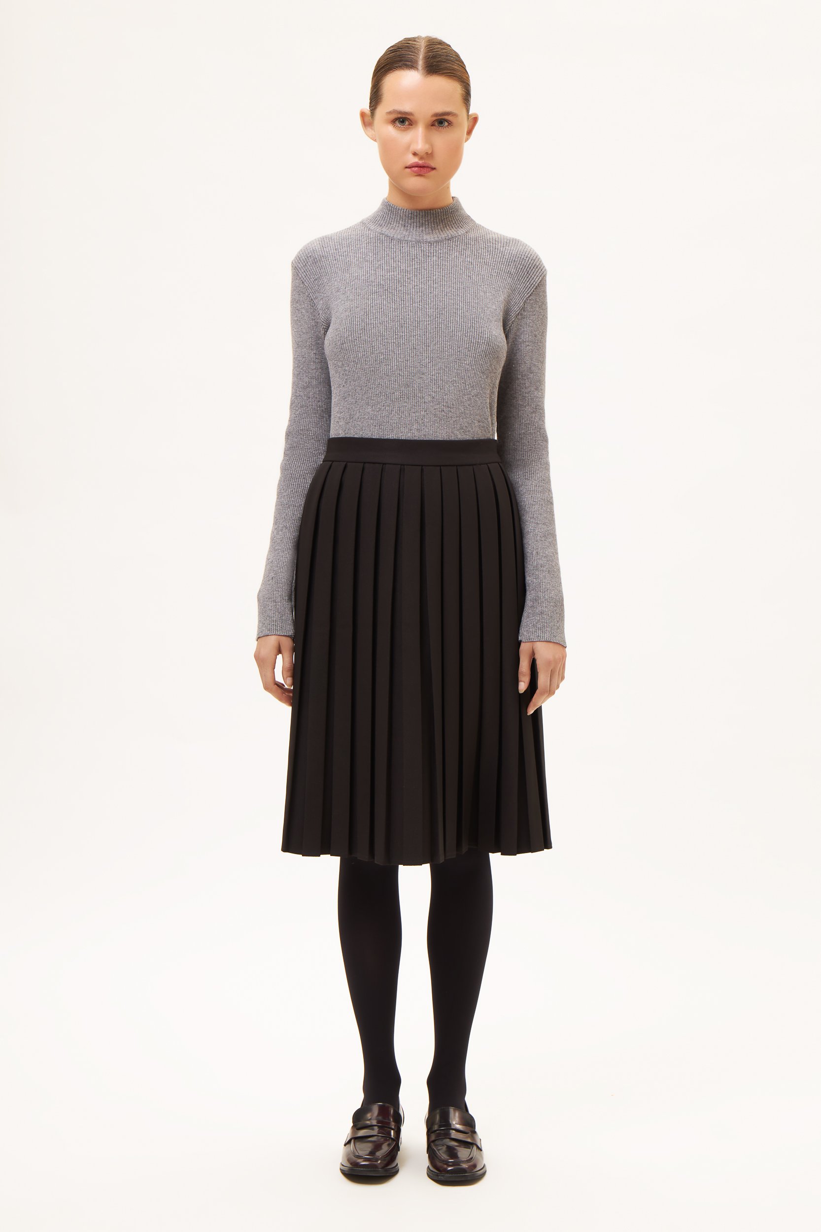 Μϊντι φούστα σε κολεγιακό στυλ διαθέτει εφαρμοστή μπάσκα και φερμουάρ στο πλάι. Διαθέσιμη σε χακί και μαύρο, η φούστα συνδυάζει κλασικό στυλ και ευκολία, καθιστώντας την ιδανική τόσο για επίσημες όσο και για casual εμφανίσεις. Το μήκος προσθέτει κομψότητα, ενώ οι συνεχόμενες πιέτες δημιουργούν μια άψογη εμφάνιση.