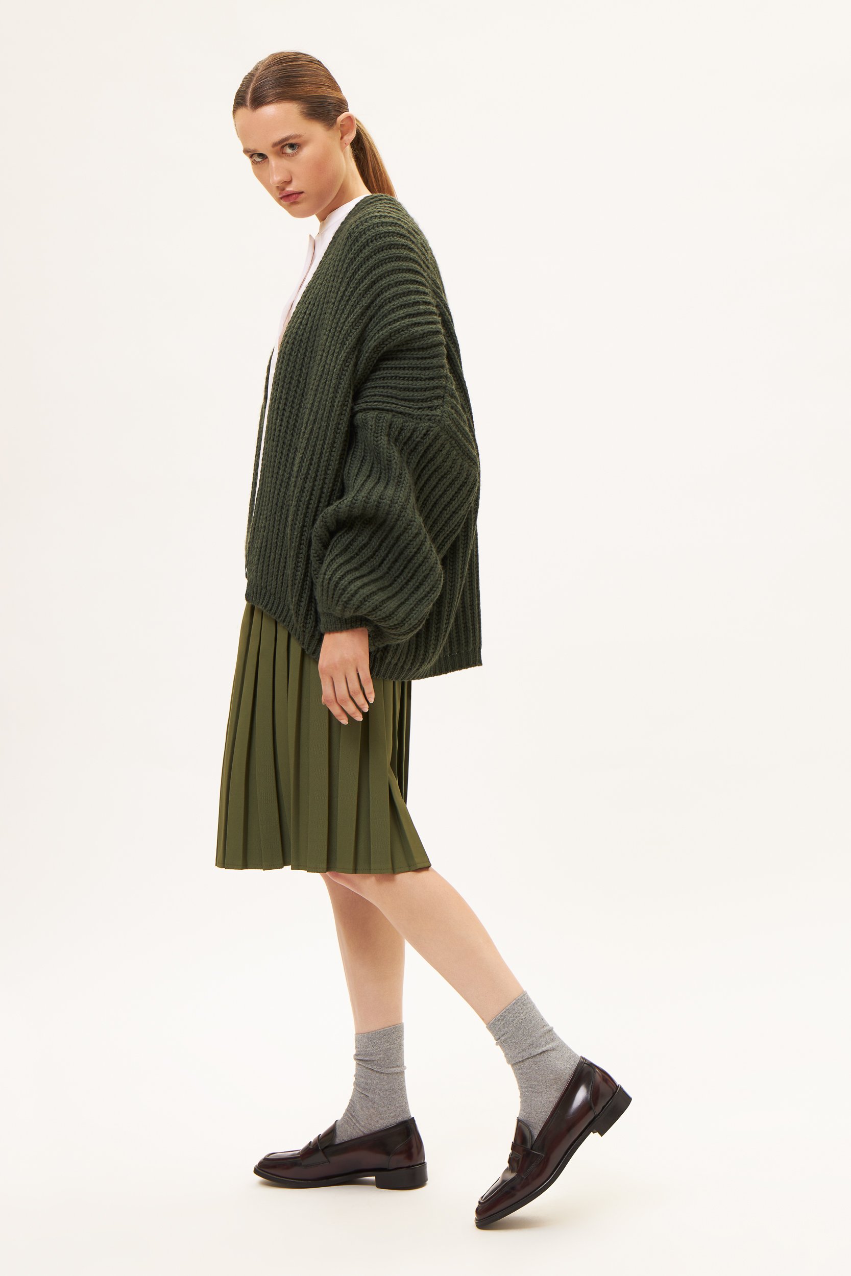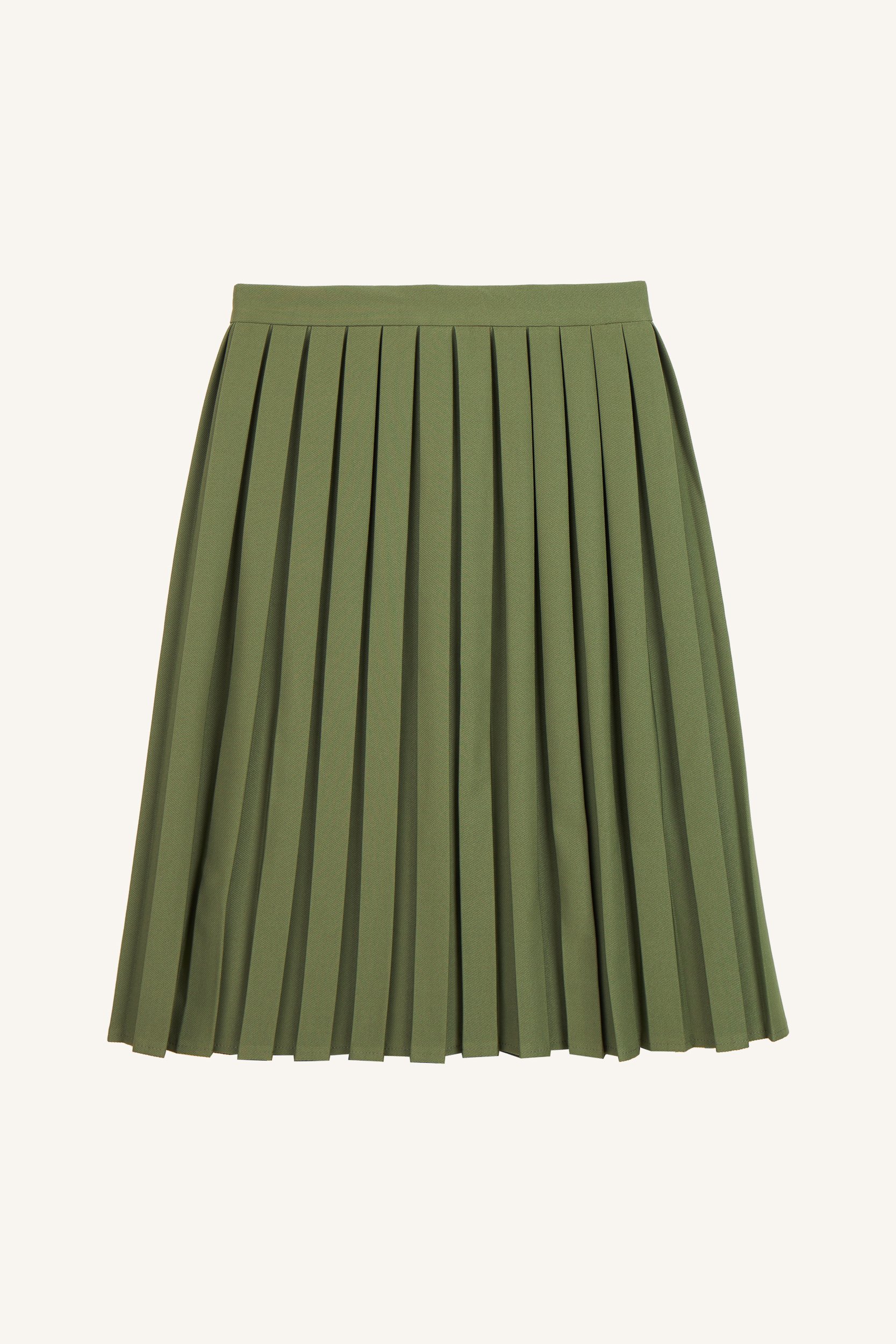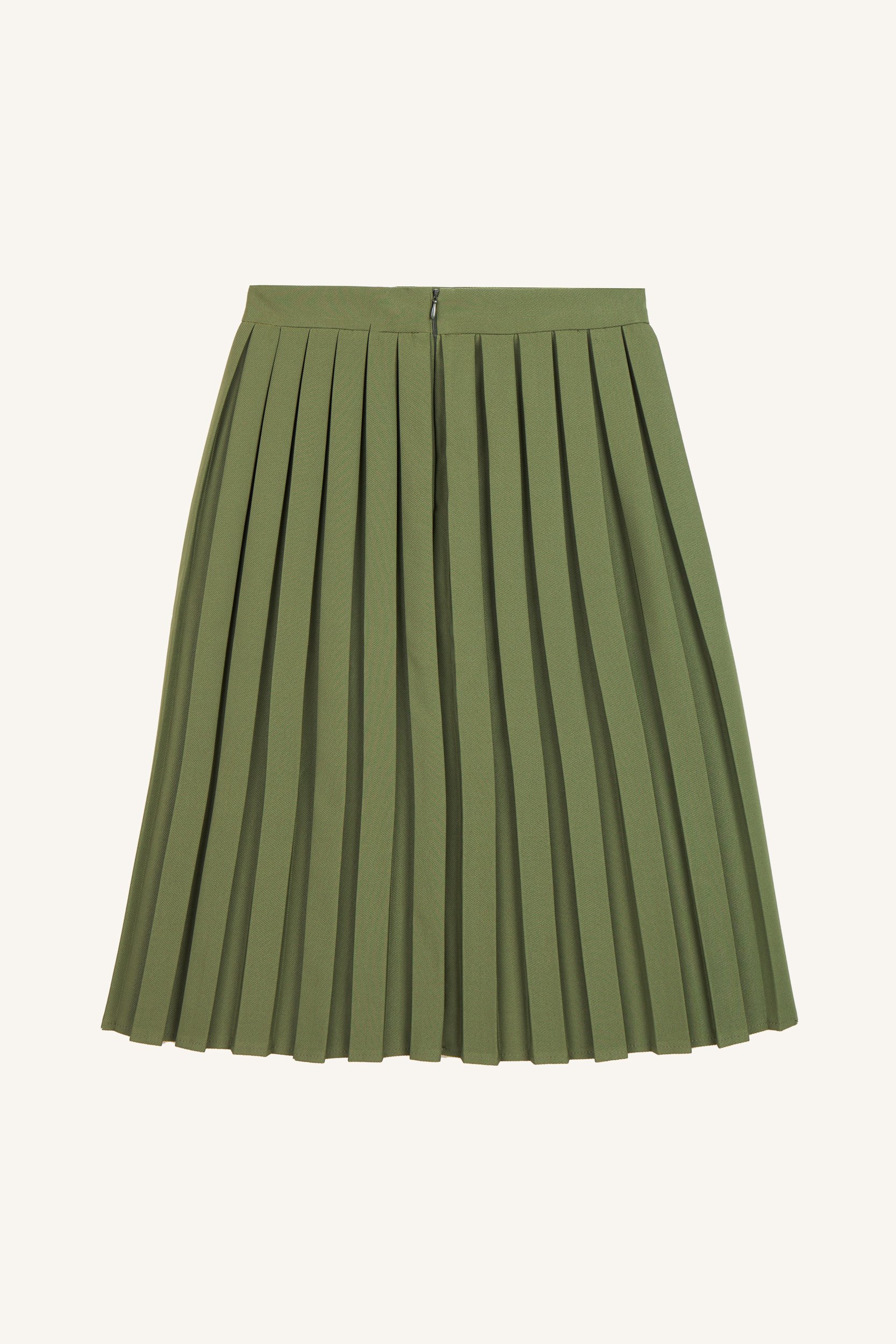 Μίντι φούστα σε κολεγιακό στυλ διαθέτει εφαρμοστή μπάσκα και φερμουάρ στο πλάι. Διαθέσιμη σε χακί και μαύρο, η φούστα συνδυάζει κλασικό στυλ και ευκολία, καθιστώντας την ιδανική τόσο για επίσημες όσο και για casual εμφανίσεις. Το μήκος προσθέτει κομψότητα, ενώ οι συνεχόμενες πιέτες δημιουργούν μια άψογη εμφάνιση.
