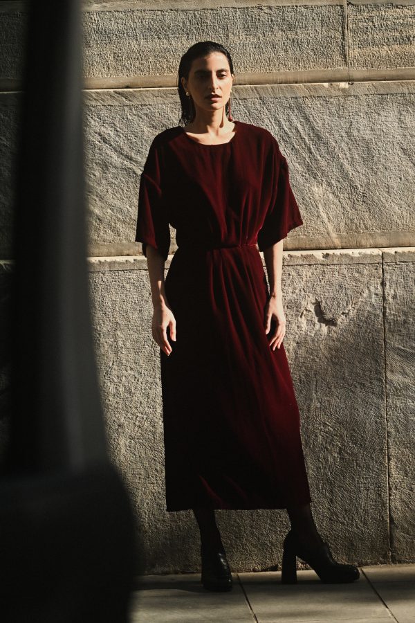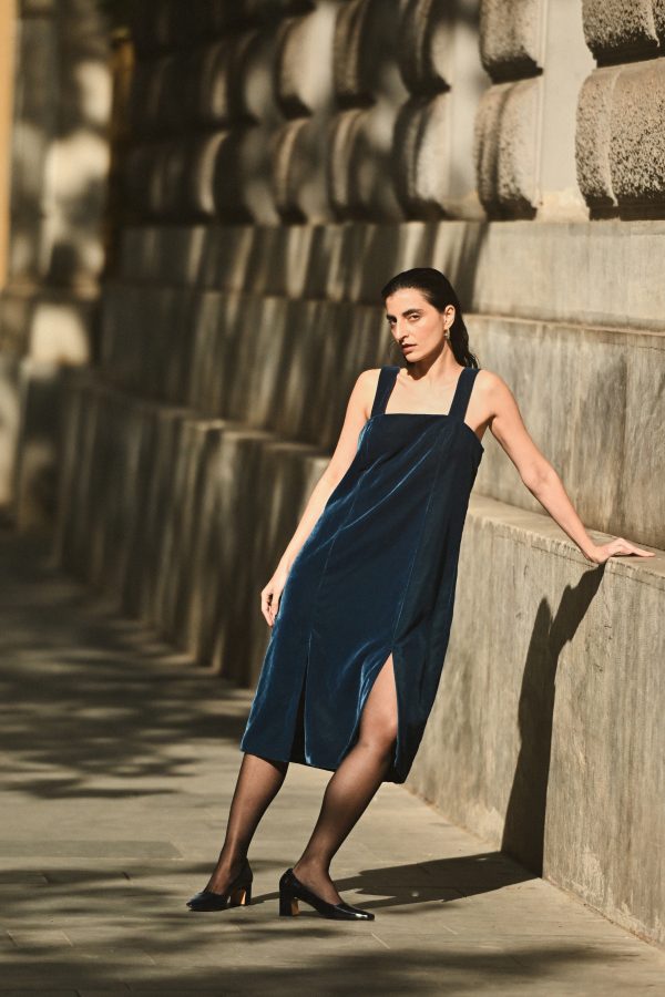 Βελούδινο μίντι φόρεμα σε βαθύ μπλε χρώμα