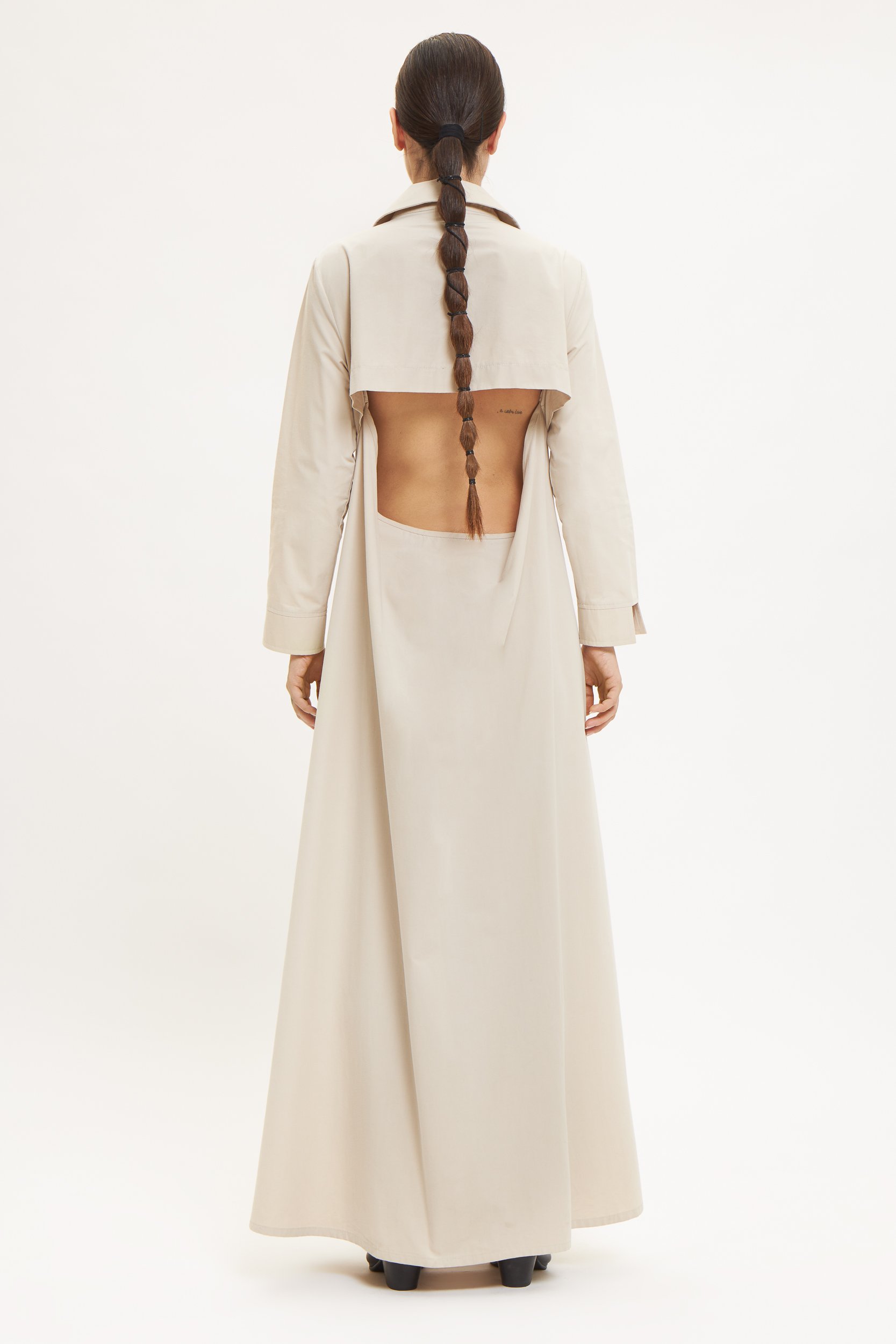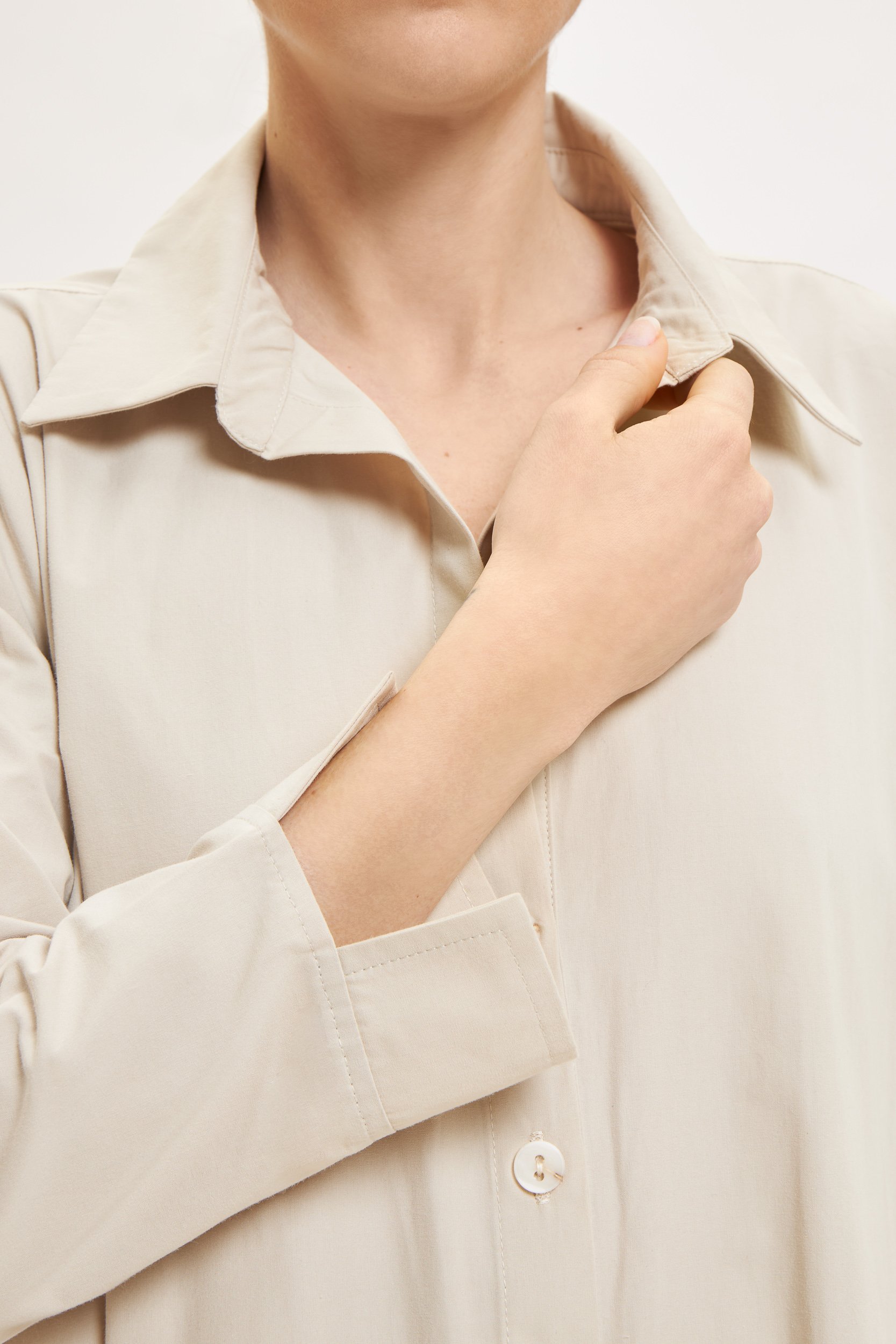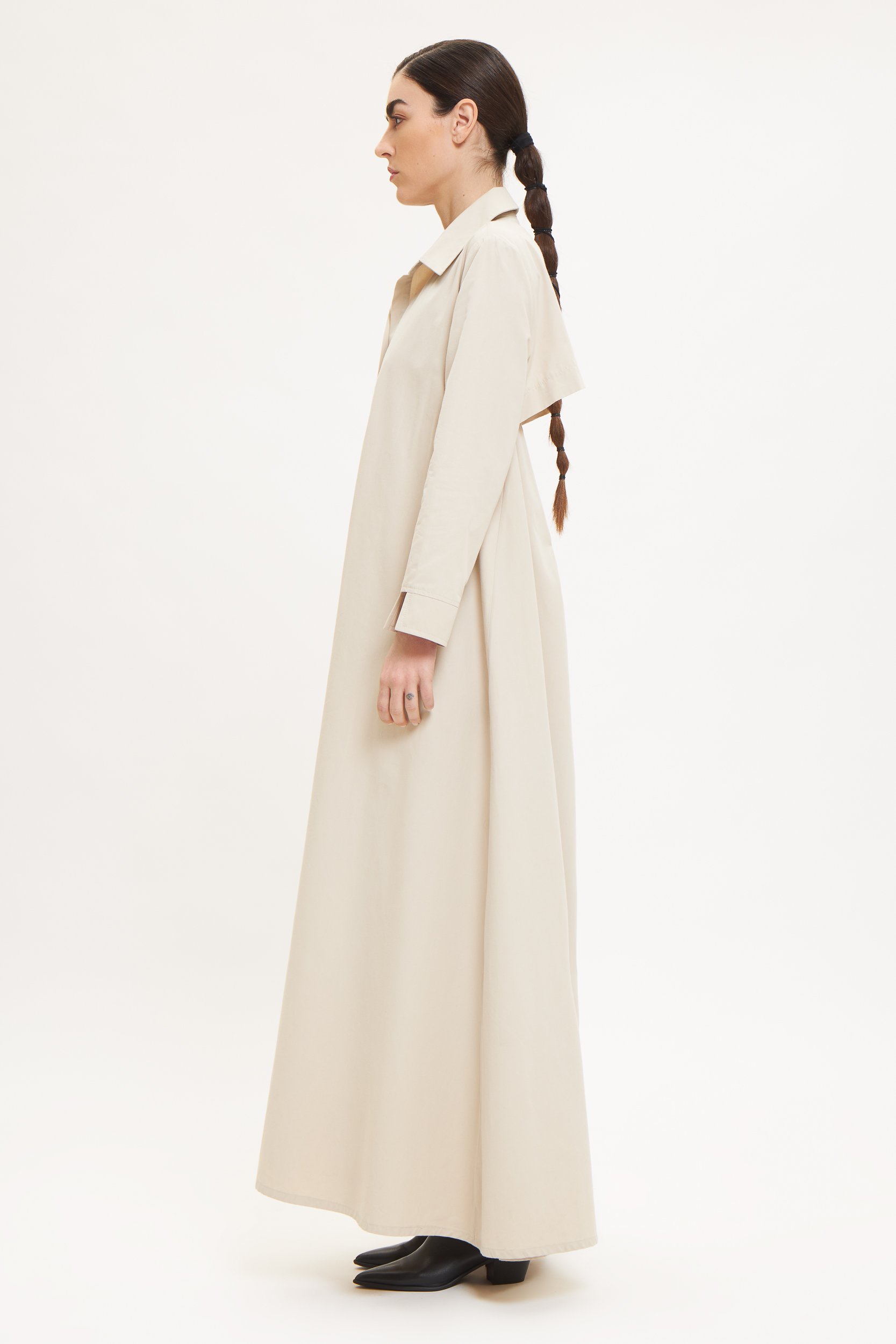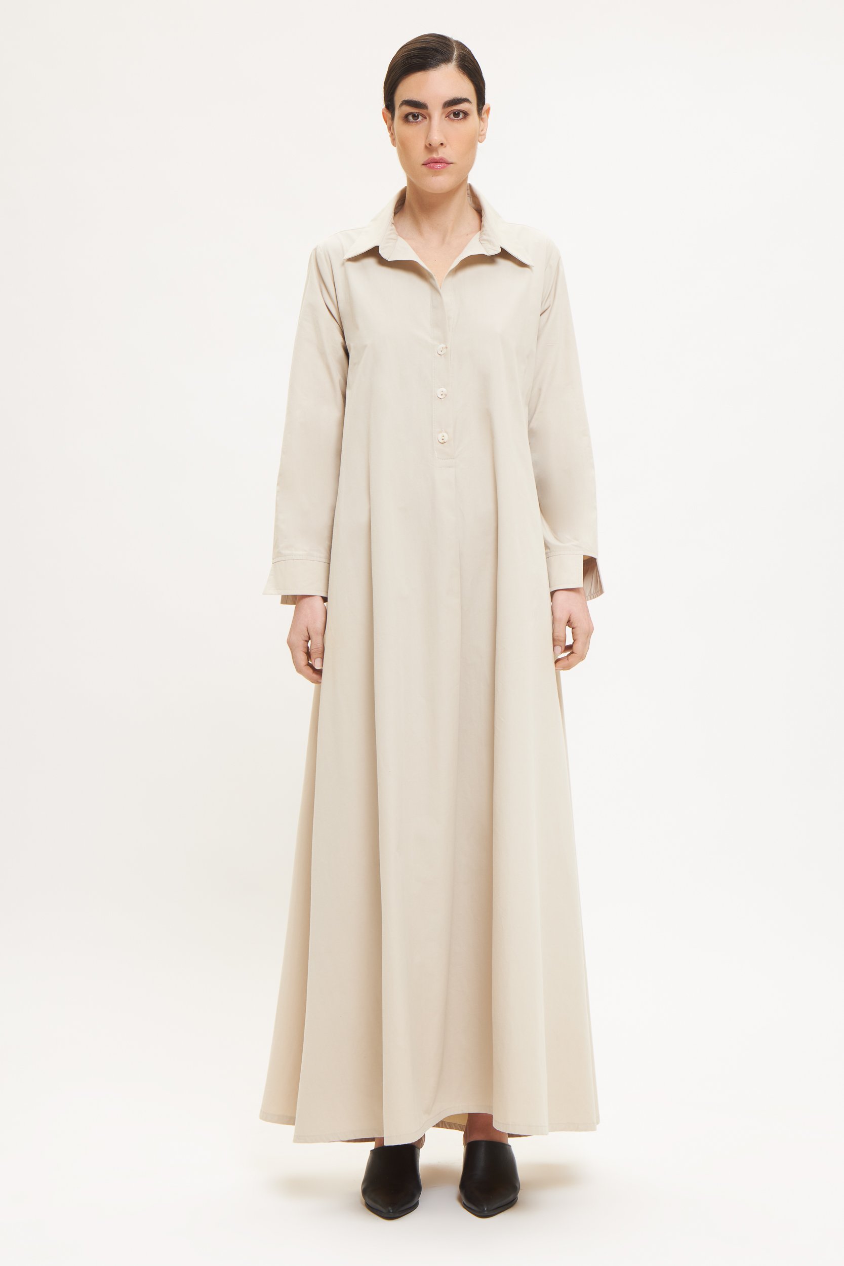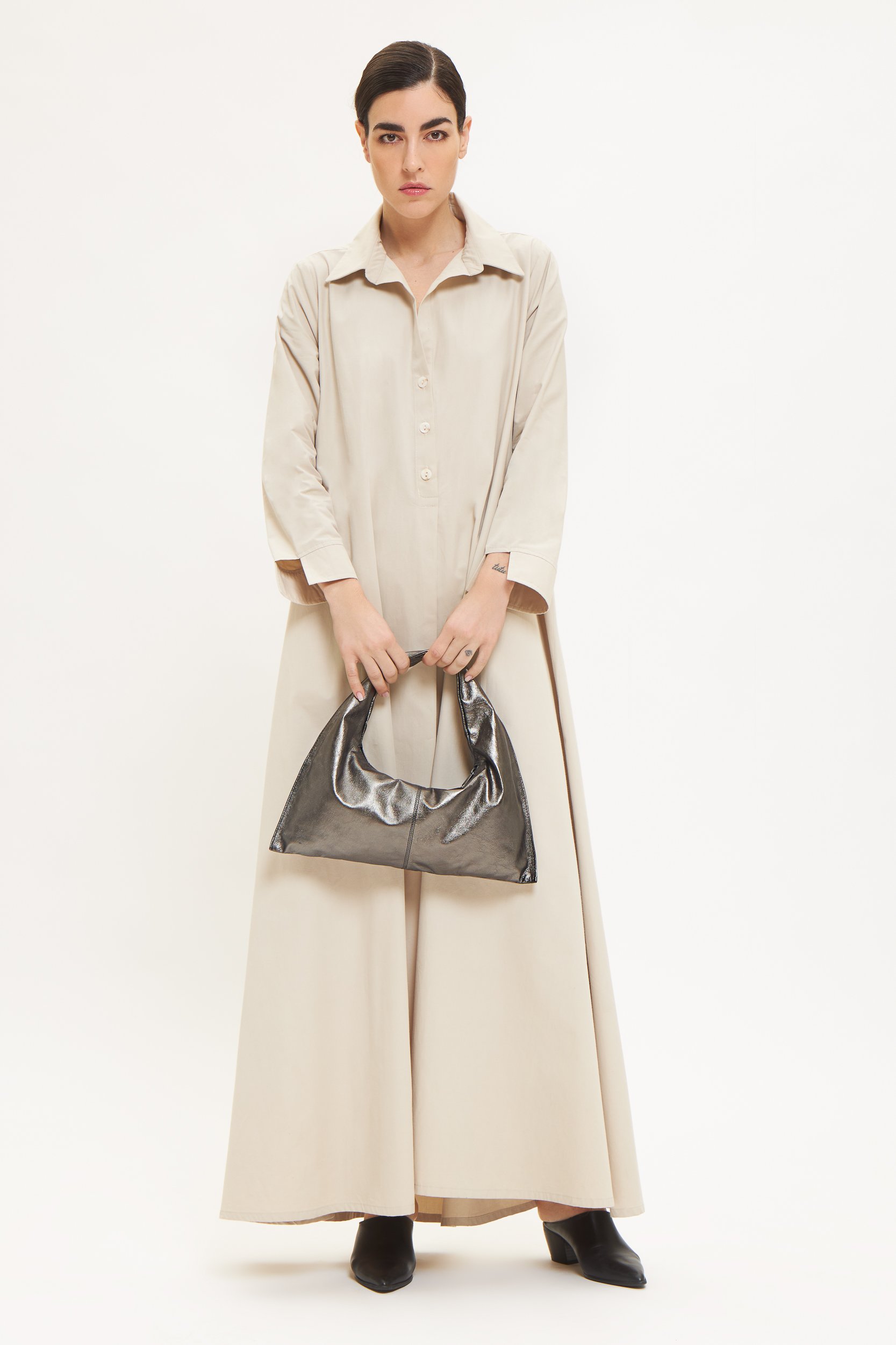 Φτιαγμένο από μαλακό βαμβακερό ύφασμα, αυτό το φόρεμα αποπνέει αβίαστη κομψότητα. Οι καθαρές γραμμές και η ρευστή σιλουέτα του πέφτουν αβίαστα, κάνοντάς το ένα διαχρονικό κομμάτι για κάθε περίσταση.