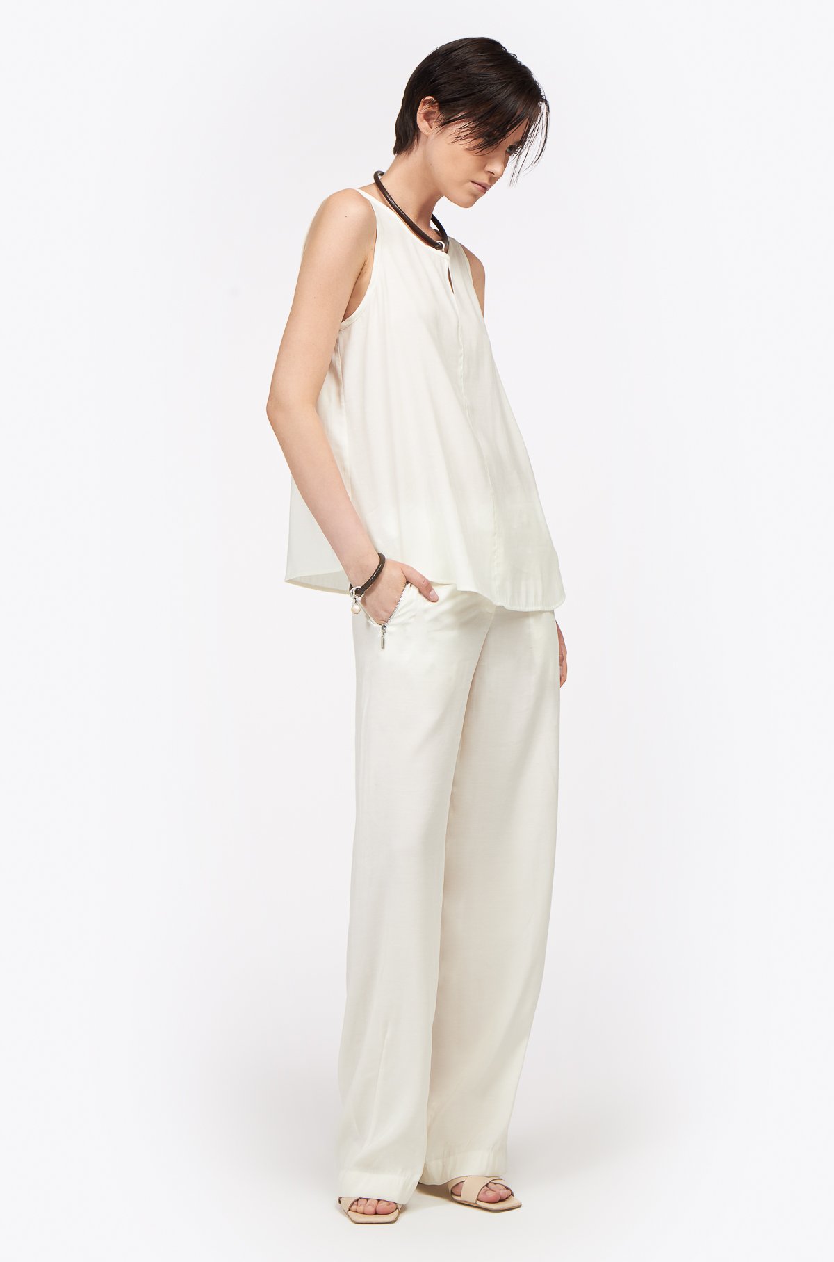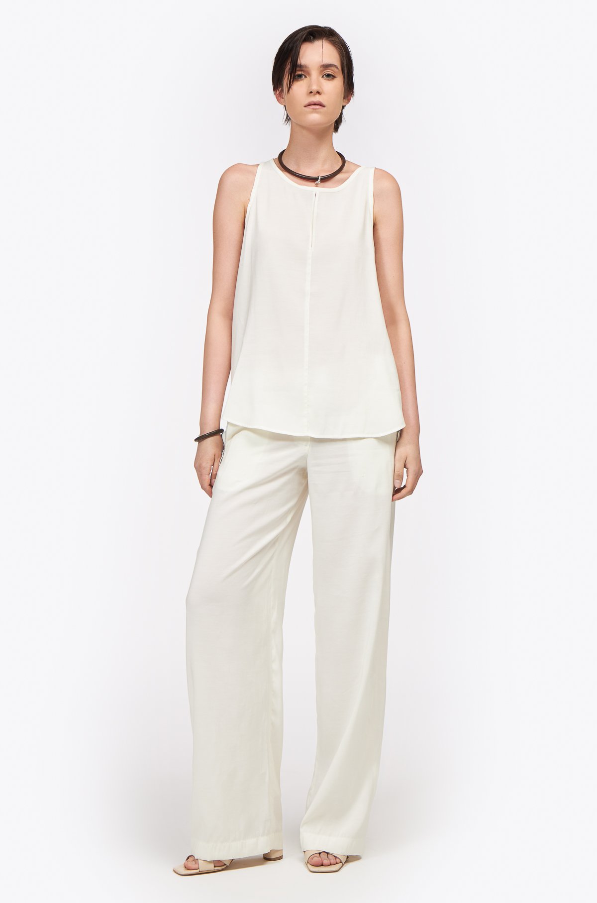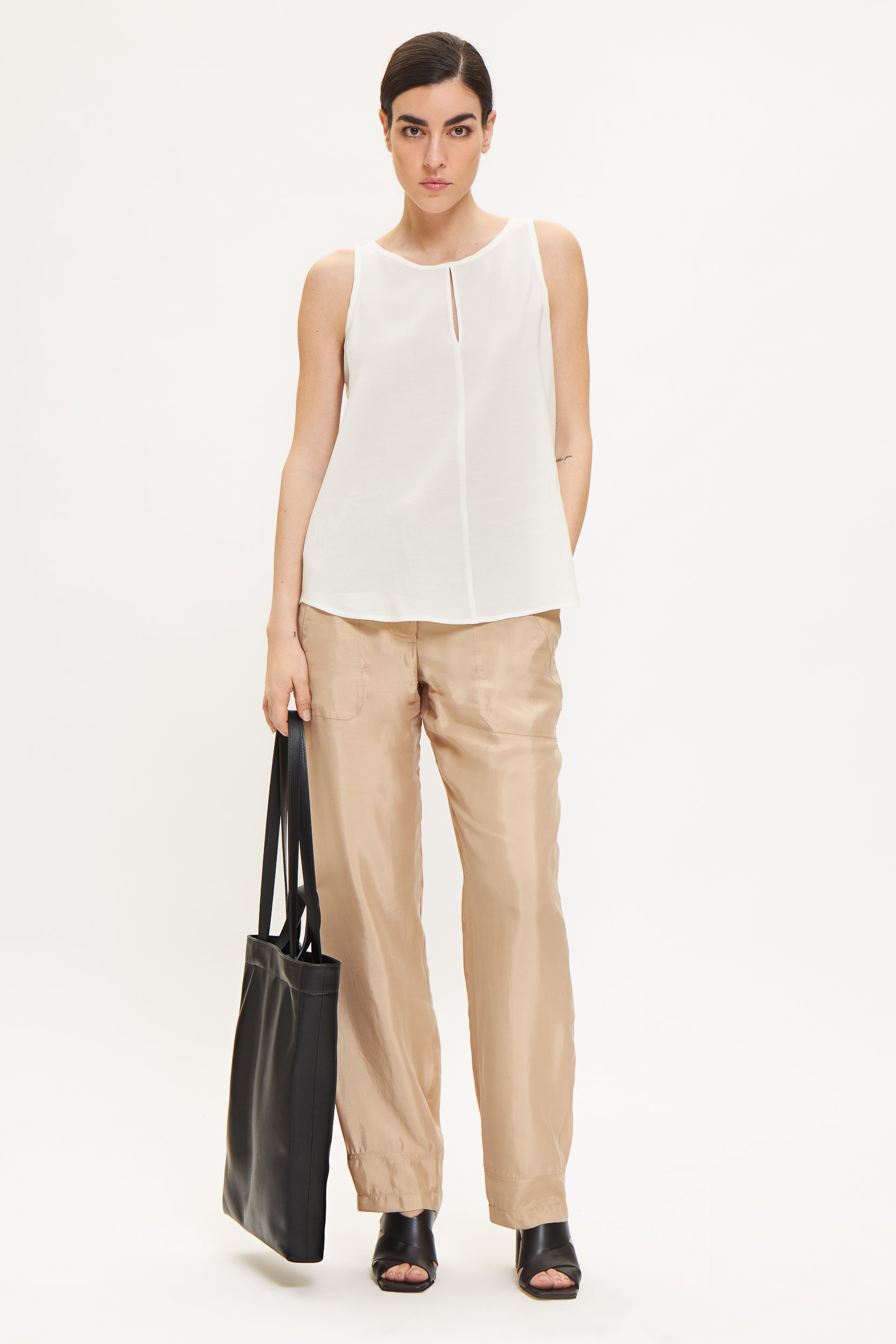 Αμάνικο τοπ από ραγιόν, με γραμμή Α που αναδεικνύει τη θηλυκή σιλουέτα. Διαθέτει λεπτές τιράντες και φαρδύ στρογγυλό ντεκολτέ στο μπροστινό μέρος.