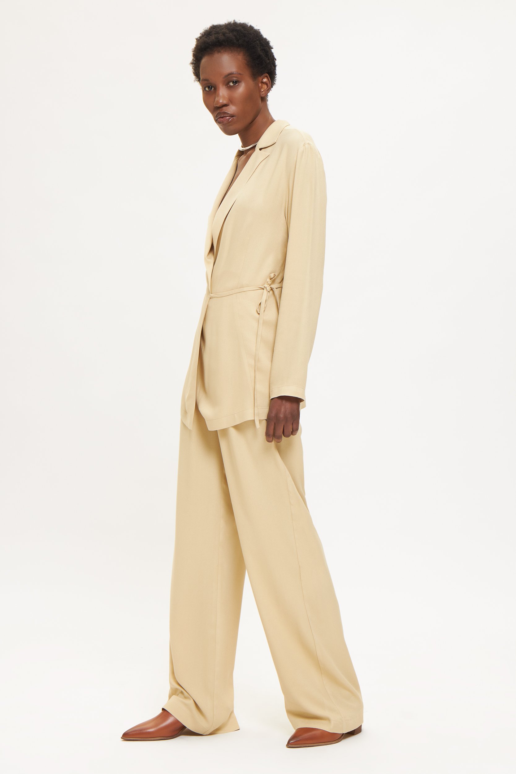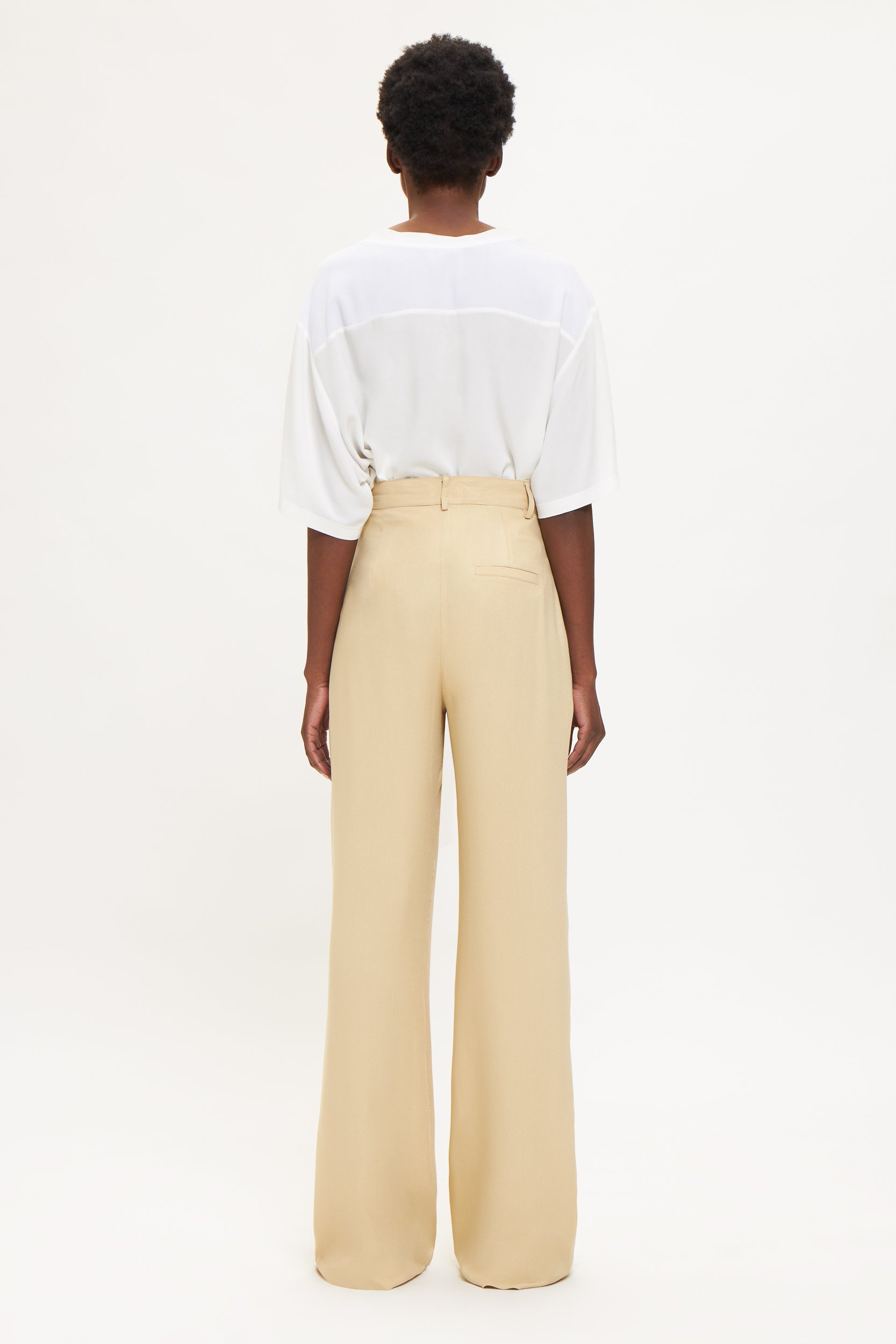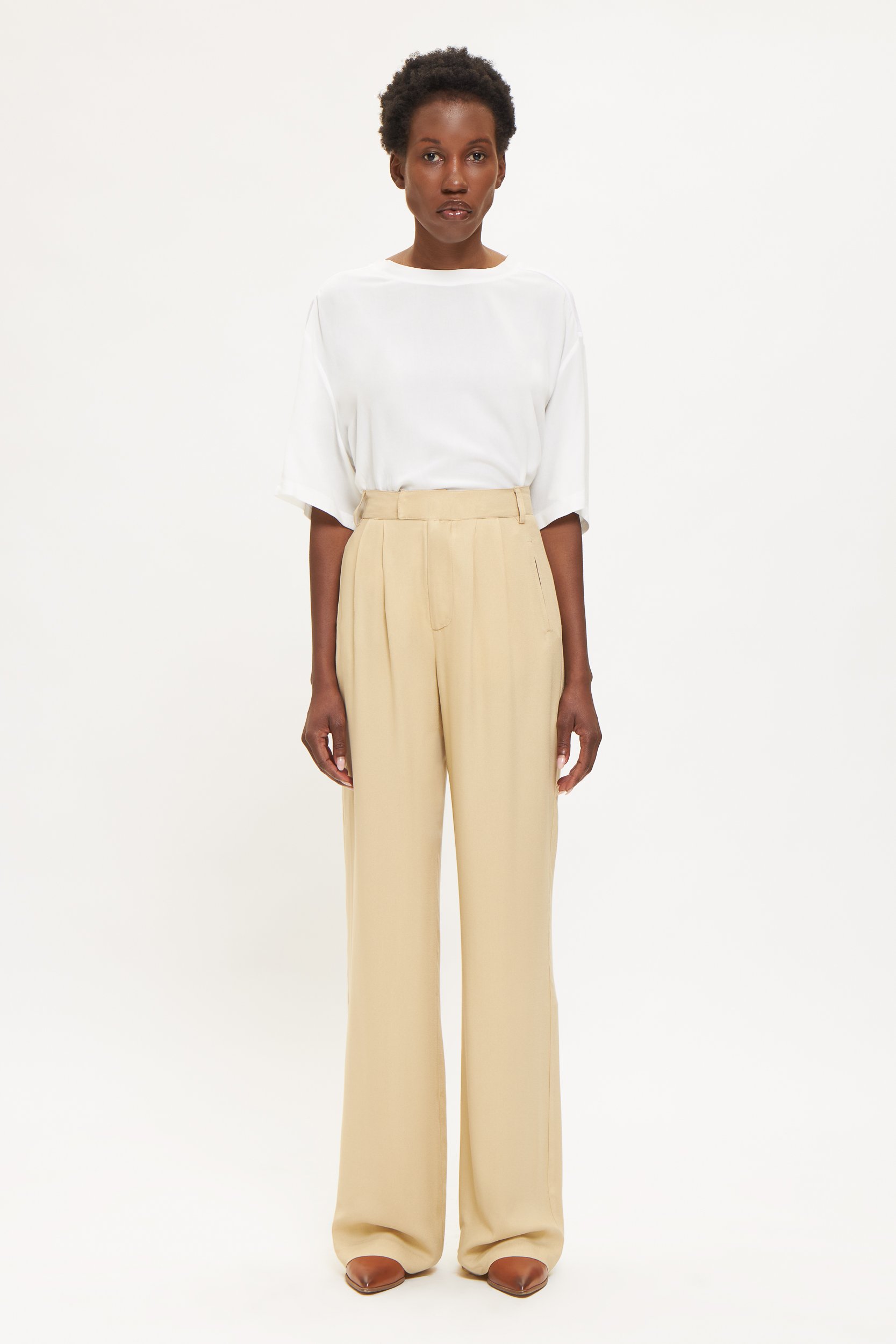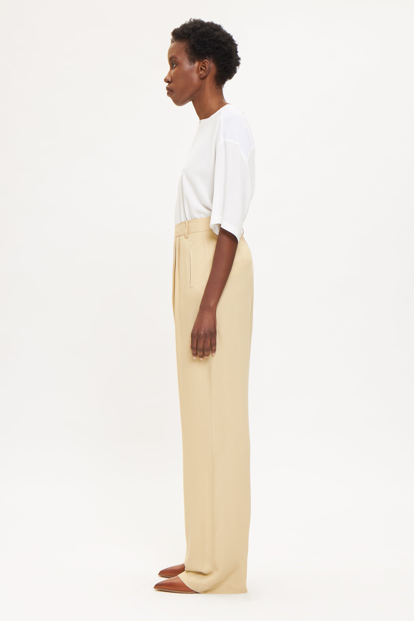 Αυτό το παντελόνι συνδυάζει άνεση και διακριτική κομψότητα. Κατασκευασμένο από βισκόζη, με κρυφές πιέτες μπροστά που προσφέρουν καθαρές γραμμές και ρευστή σιλουέτα. Η μέση εφαρμόζει με φερμουάρ και κουμπί, διαθέτει θηλιές για ζώνη και πρακτικές πλαϊνές τσέπες.