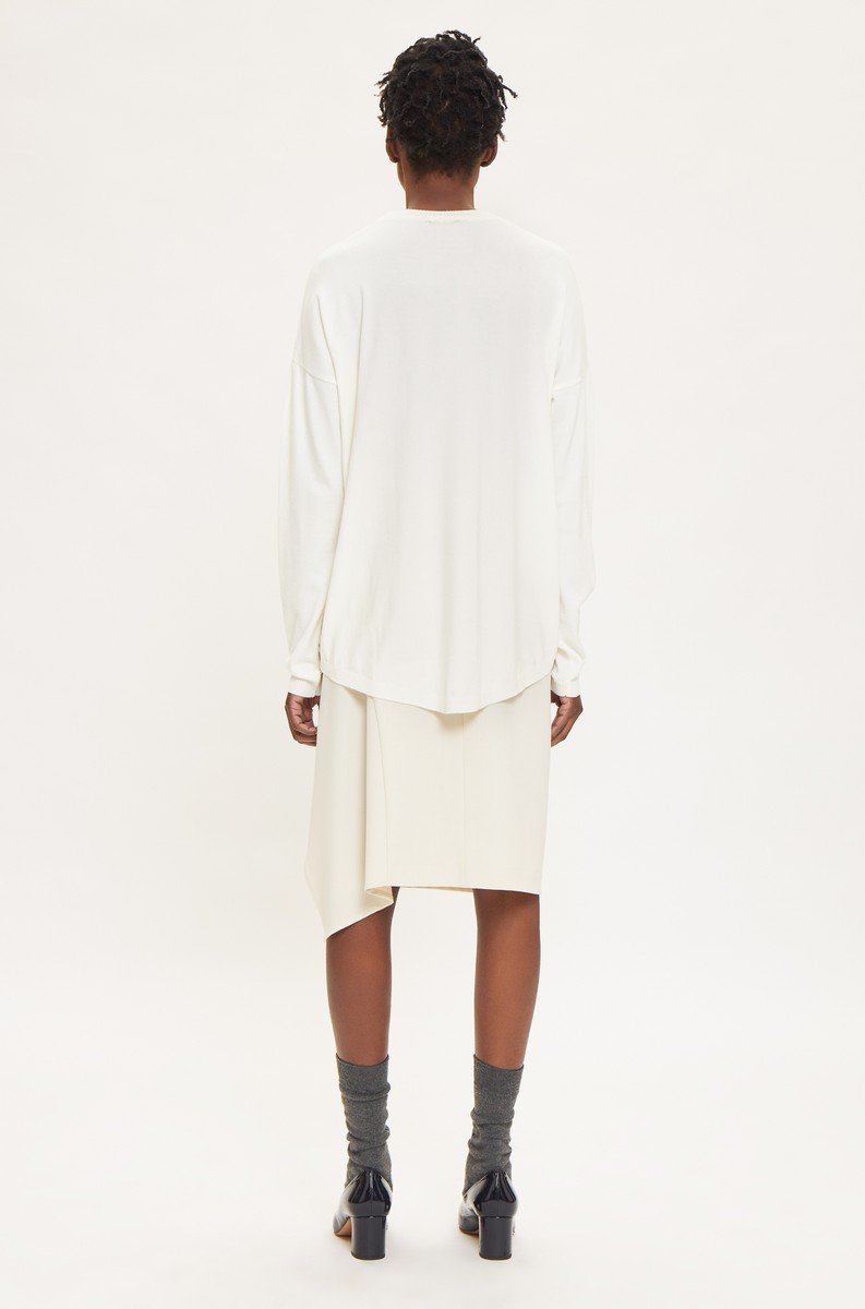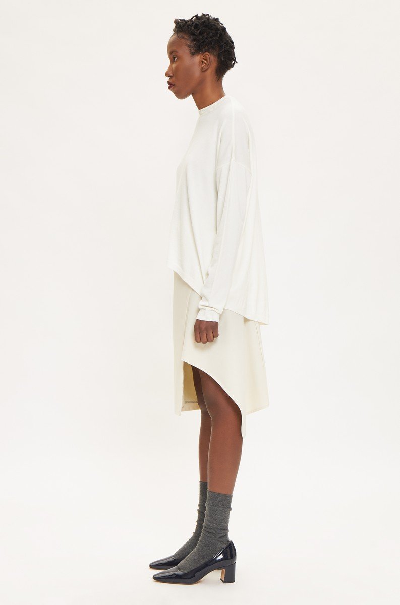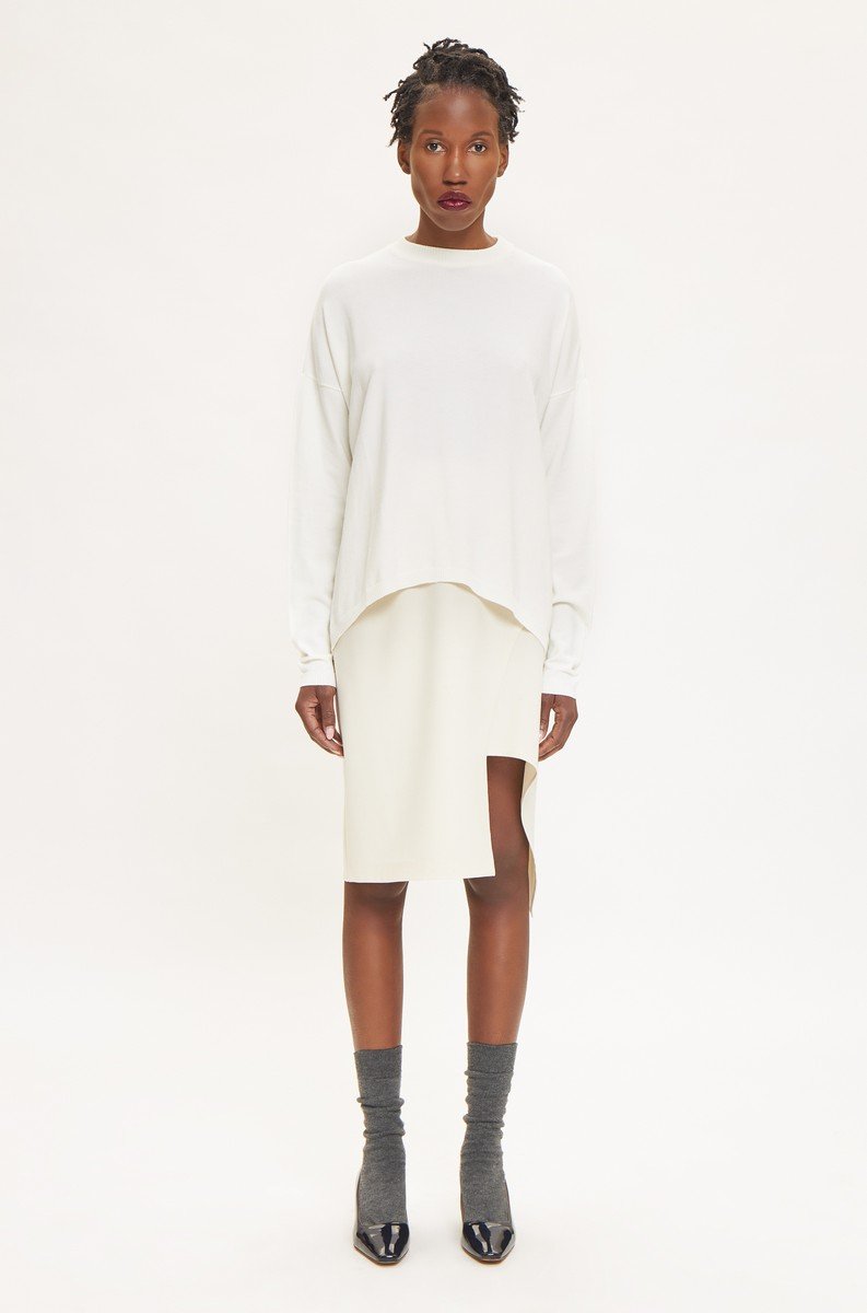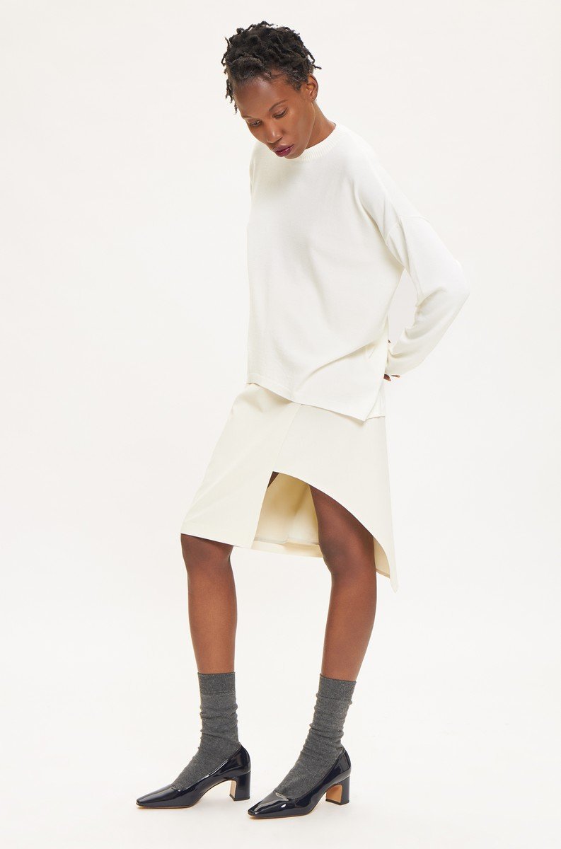 Midi ψηλόμεση φούστα με καθαρό μπροστινό μέρος και ασύμμετρο τελείωμα που τονίζει την σιλουέτα. Το ύφασμα έχει συμπαγή υφή και ελαφριά ελαστικότητα, προσφέροντας σταθερή φόρμα και άνεση στην κίνηση. Ευέλικτη επιλογή για το γραφείο ή την καθημερινότητα.