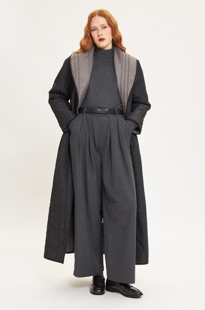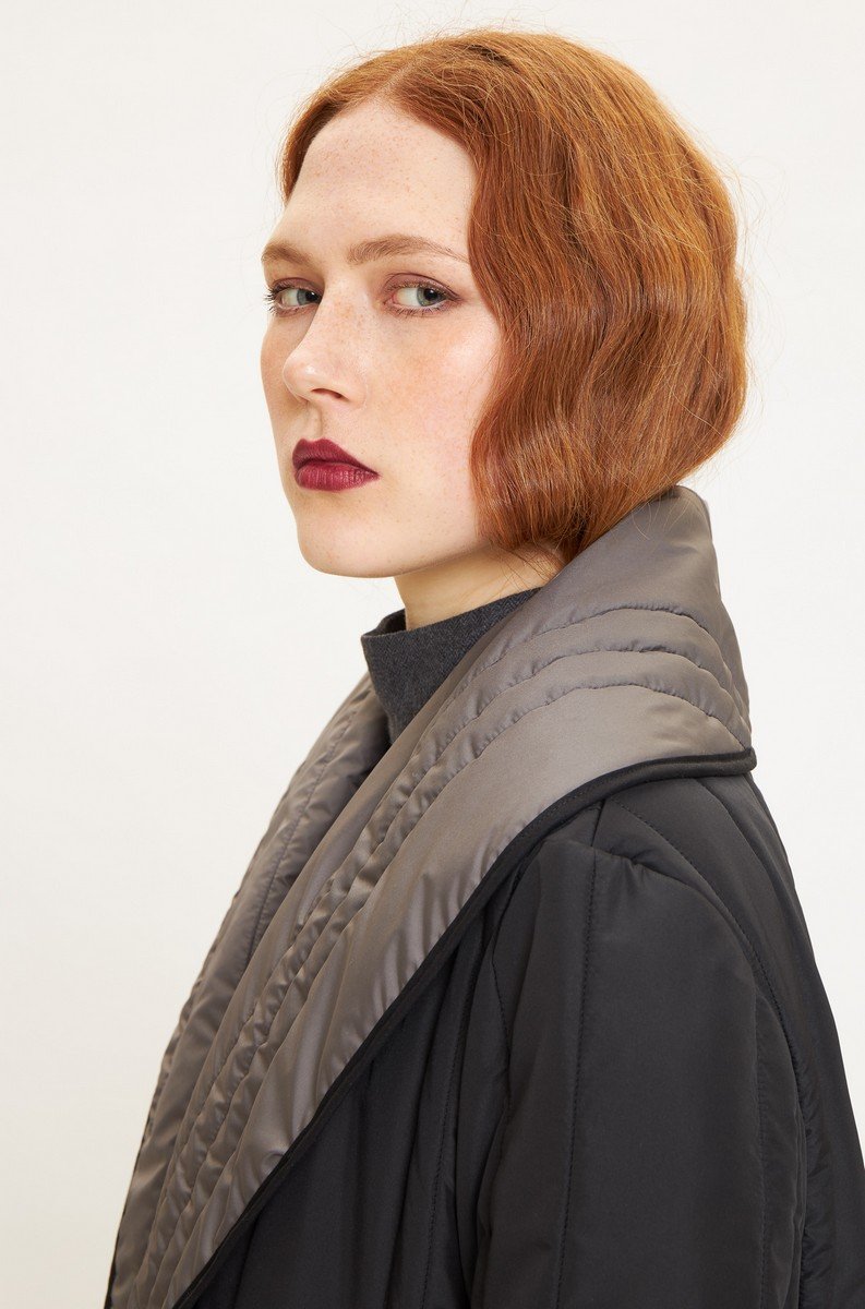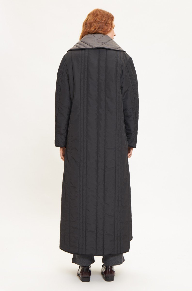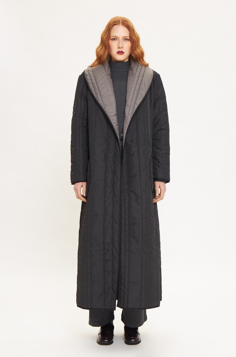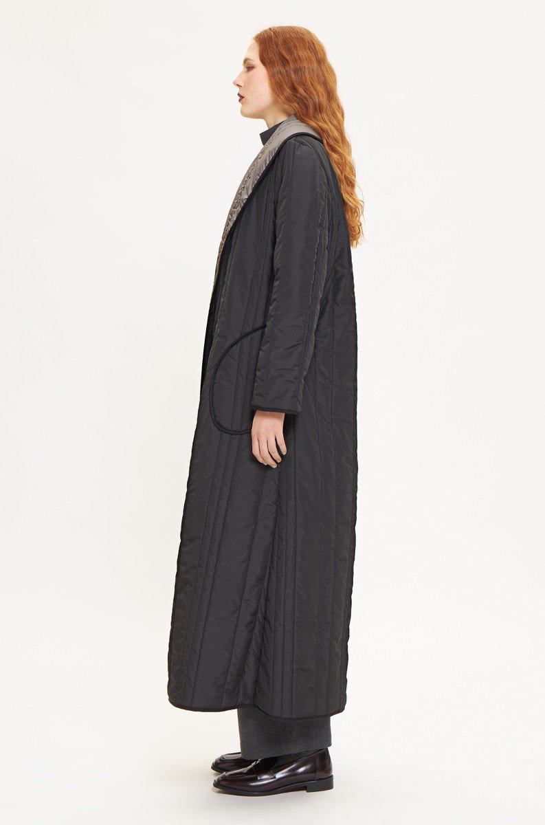 Μακρύ καπιτονέ παλτό από ελαφρύ πολυεστέρα με απαλή επένδυση. Η ίσια, μακριά γραμμή του και η αποσπώμενη ζώνη. Η εσωτερική αντίθεση και τα φαρδιά πέτα προσθέτουν βάθος στη λιτή του φόρμα, ενώ η κατασκευή του το καθιστά λειτουργικό και ευέλικτο κομμάτι για layering και καθημερινή χρήση.