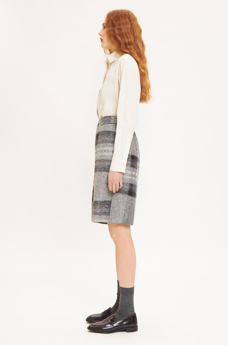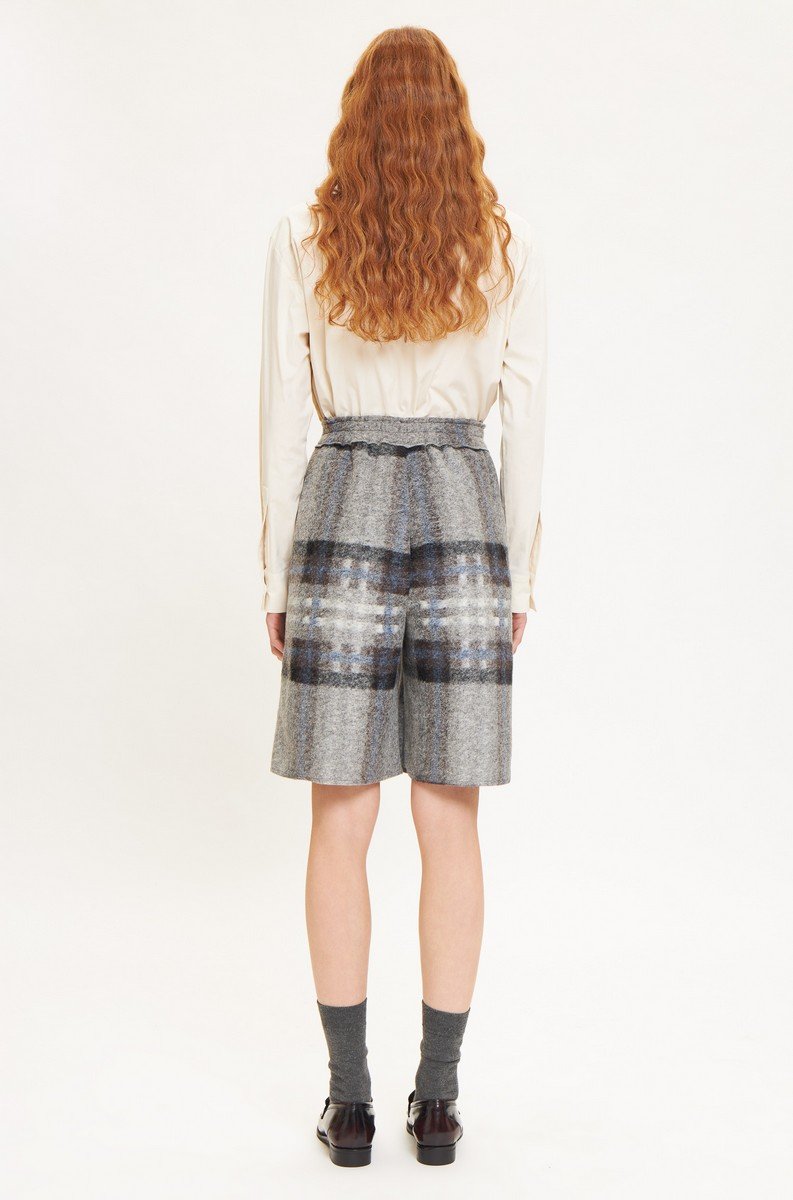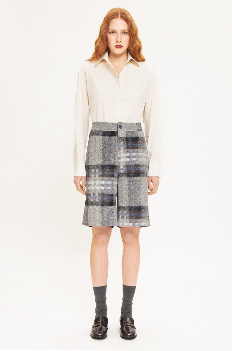 Μάλλινη βερμούδα με ίσια, χαλαρή γραμμή και καθαρό μπροστινό κούμπωμα, προσφέρει ζεστασιά, ενώ το καρό μοτίβο προσθέτει βάθος και διακριτική διαφοροποίηση. Διατηρεί το σχήμα της, επιτρέποντας παράλληλα φυσική κίνηση — ιδανική για τις μεταβατικές και χειμερινές εμφανίσεις.