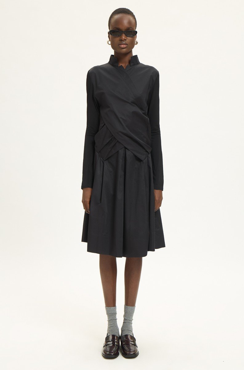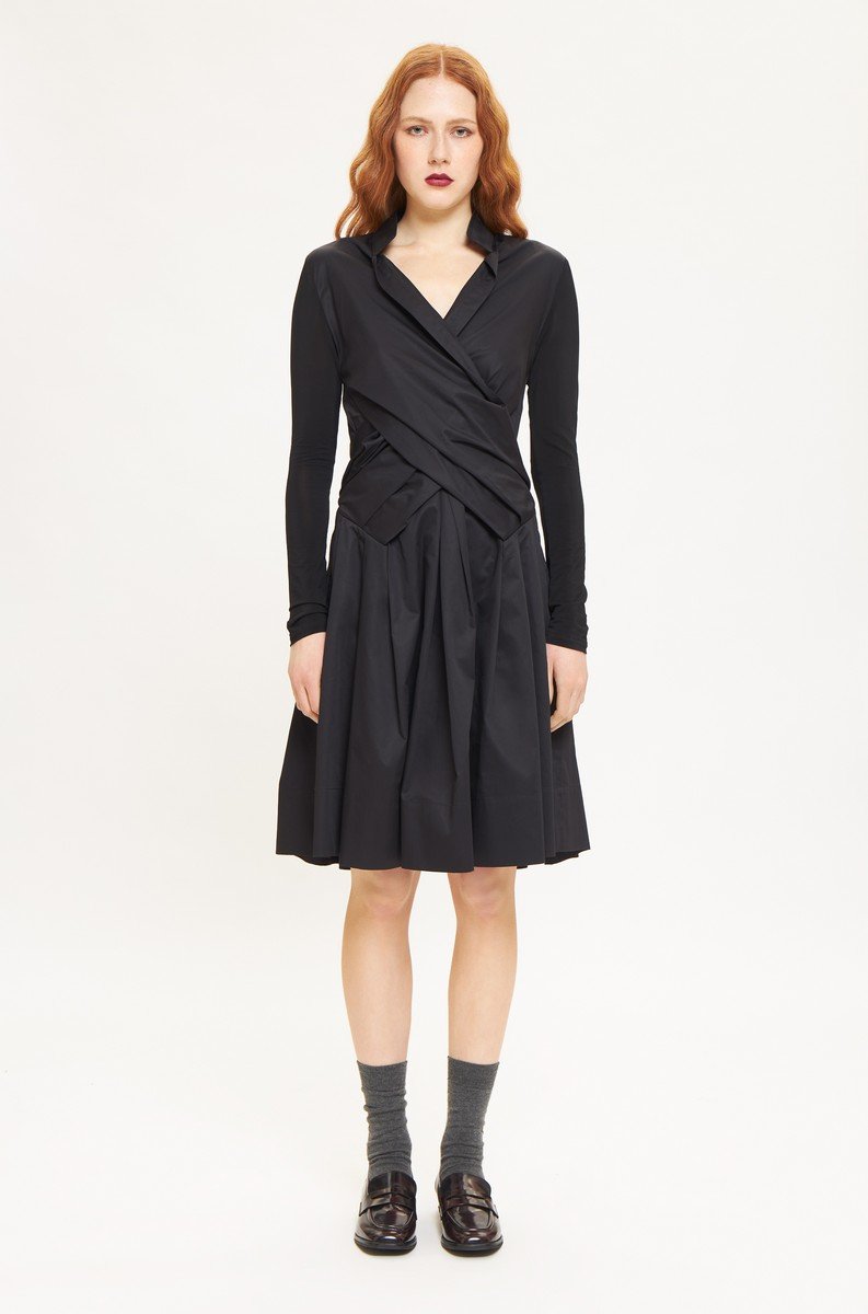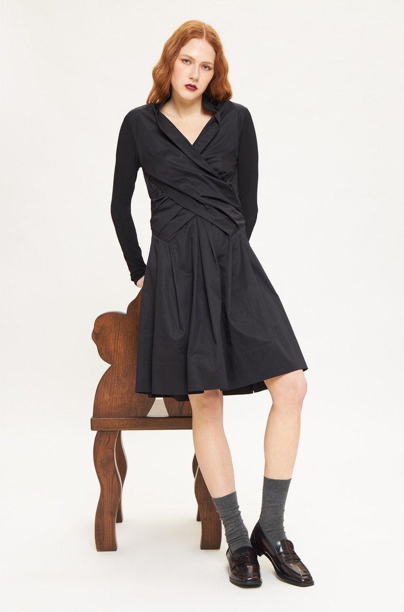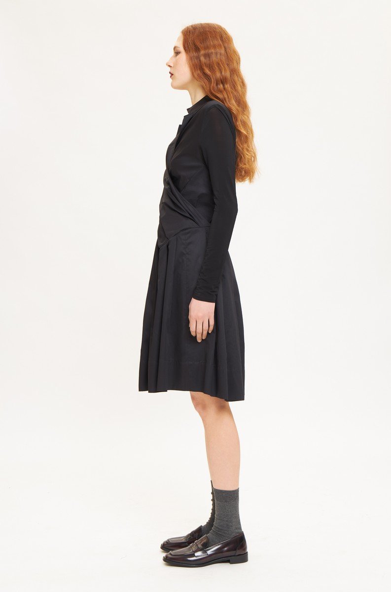 Φόρεμα-πουκάμισο με σταυρωτό μπροστινό μέρος που σχηματίζει διακριτικό Χ στη μέση. Το επάνω μέρος εφαρμόζει στο σώμα, ενώ η φούστα ανοίγει με απαλές πιέτες μπροστά και πίσω, προσφέροντας κίνηση και όγκο. Ο γιακάς και το V ντεκολτέ πλαισιώνουν όμορφα το πρόσωπο, συνδυάζοντας δομή και απλότητα. Κατασκευασμένο από σταθερή βαμβακερή ποπλίνα με ελαστική βισκόζη για άνεση.