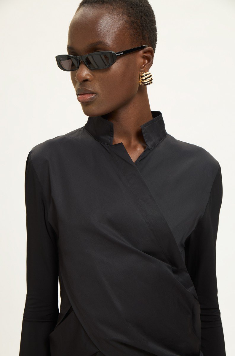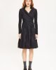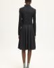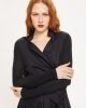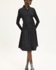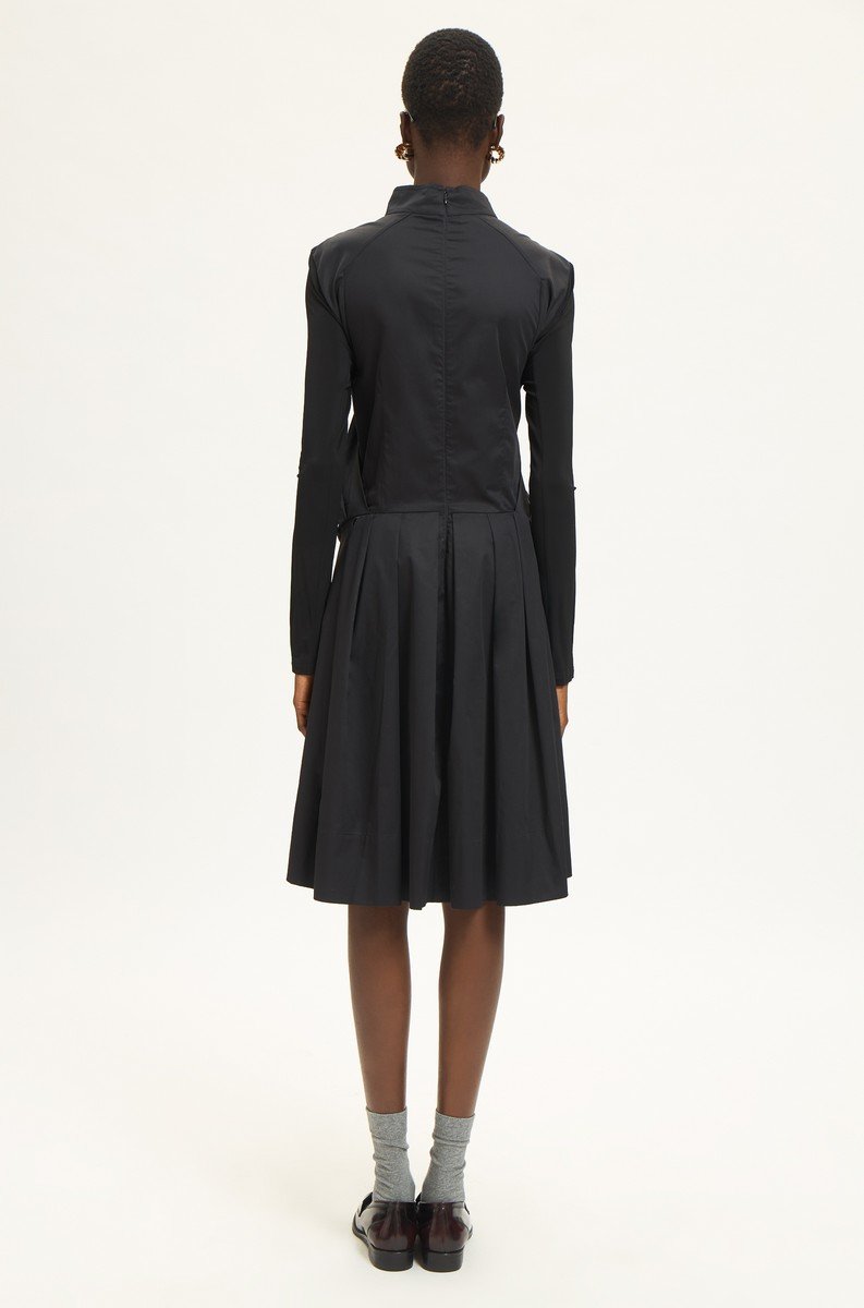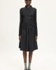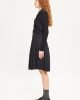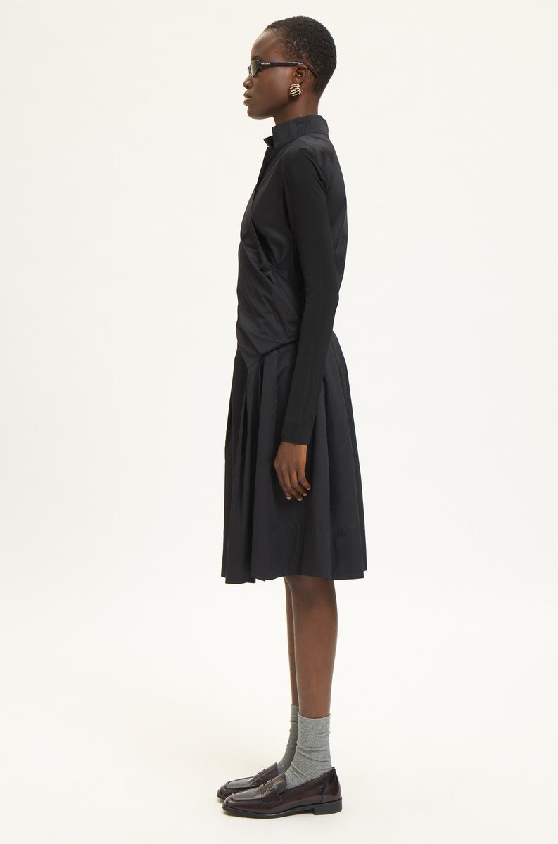 Φόρεμα-πουκάμισο με σταυρωτό μπροστινό μέρος που σχηματίζει διακριτικό Χ στη μέση. Το επάνω μέρος εφαρμόζει στο σώμα, ενώ η φούστα ανοίγει με απαλές πιέτες μπροστά και πίσω, προσφέροντας κίνηση και όγκο. Ο γιακάς και το V ντεκολτέ πλαισιώνουν όμορφα το πρόσωπο, συνδυάζοντας δομή και απλότητα. Κατασκευασμένο από σταθερή βαμβακερή ποπλίνα με ελαστική βισκόζη για άνεση.