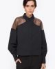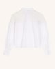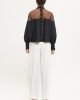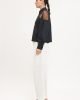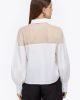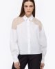 Ένα ιδιαίτερο πουκάμισο που συνδυάζει άνεση και κομψότητα. Αναπάντεχος συνδυασμός διαφάνειας στο επάνω μέρος και βαμβακερού υφάσματος στο κύριο σώμα. Διαθέτει μπροστινό κλείσιμο με κουμπιά και μακριά μανίκια με φαρδιές μανσέτες, που προσθέτουν μια κομψή πινελιά, καθιστώντας το μια μοναδική προσθήκη στη γκαρνταρόμπα σας. Διατίθεται σε λευκό και μαύρο. Το μοντέλο φοράει μέγεθος S.