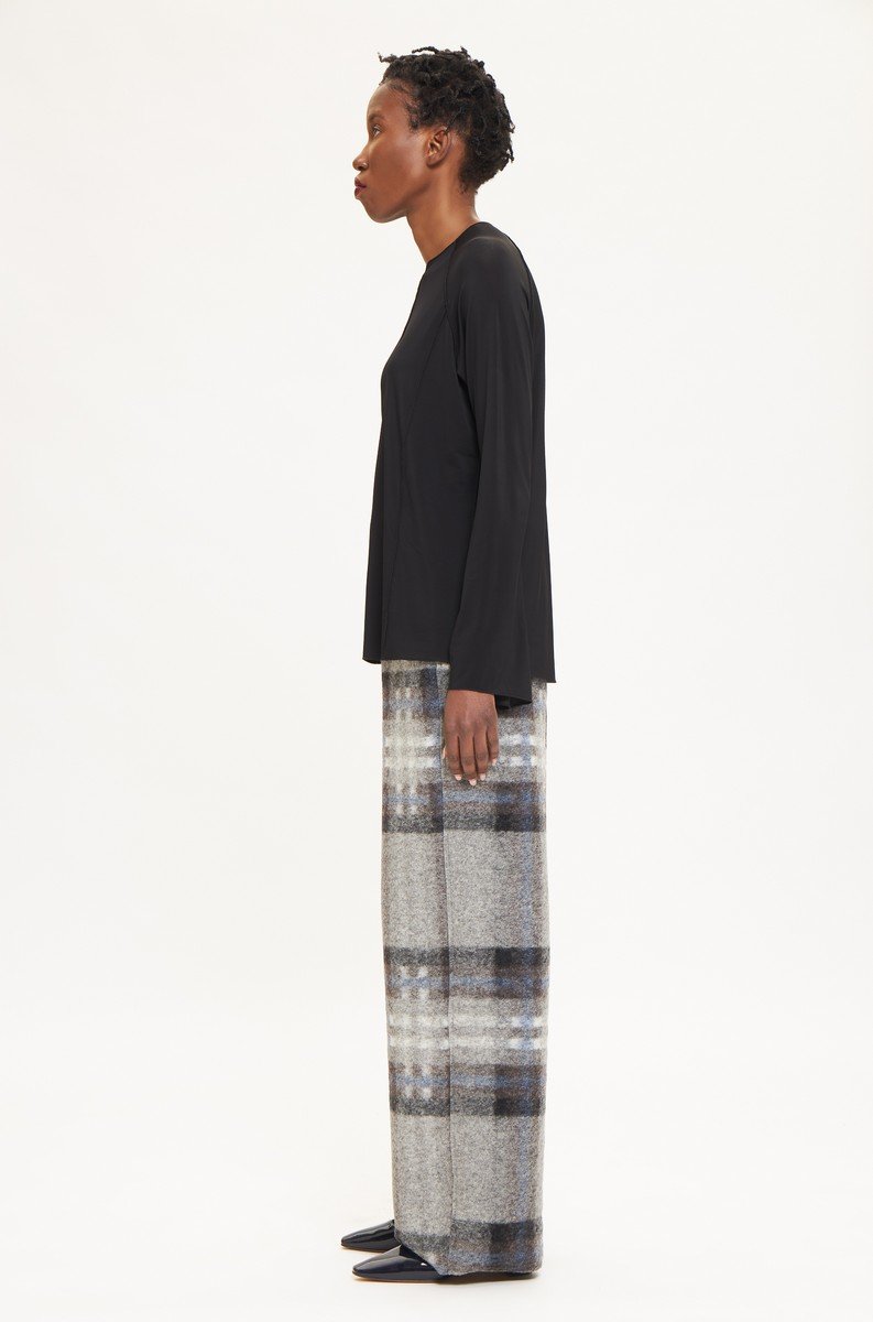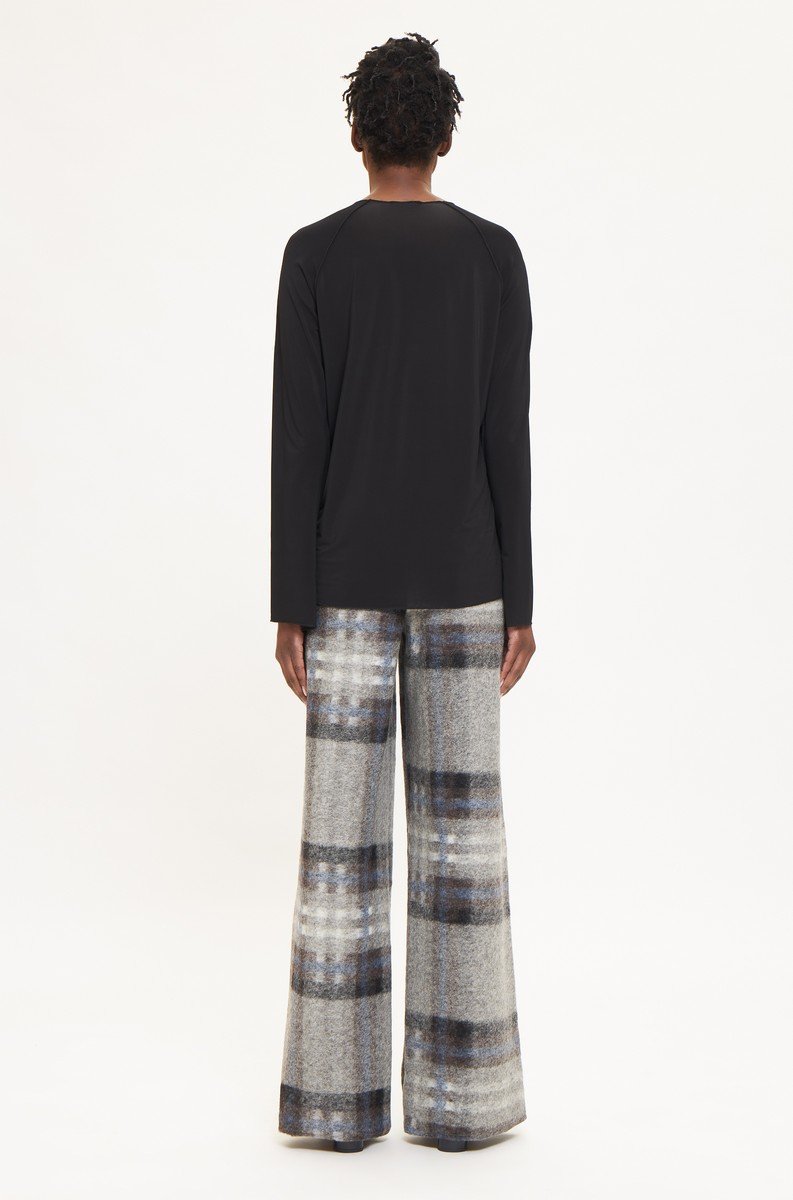 A lightweight long-sleeve top crafted from soft stretch viscose jersey. It features a clean round neckline and straight fit that drapes naturally along the body. The minimal construction and smooth texture make it an essential layering piece or a refined stand-alone top.