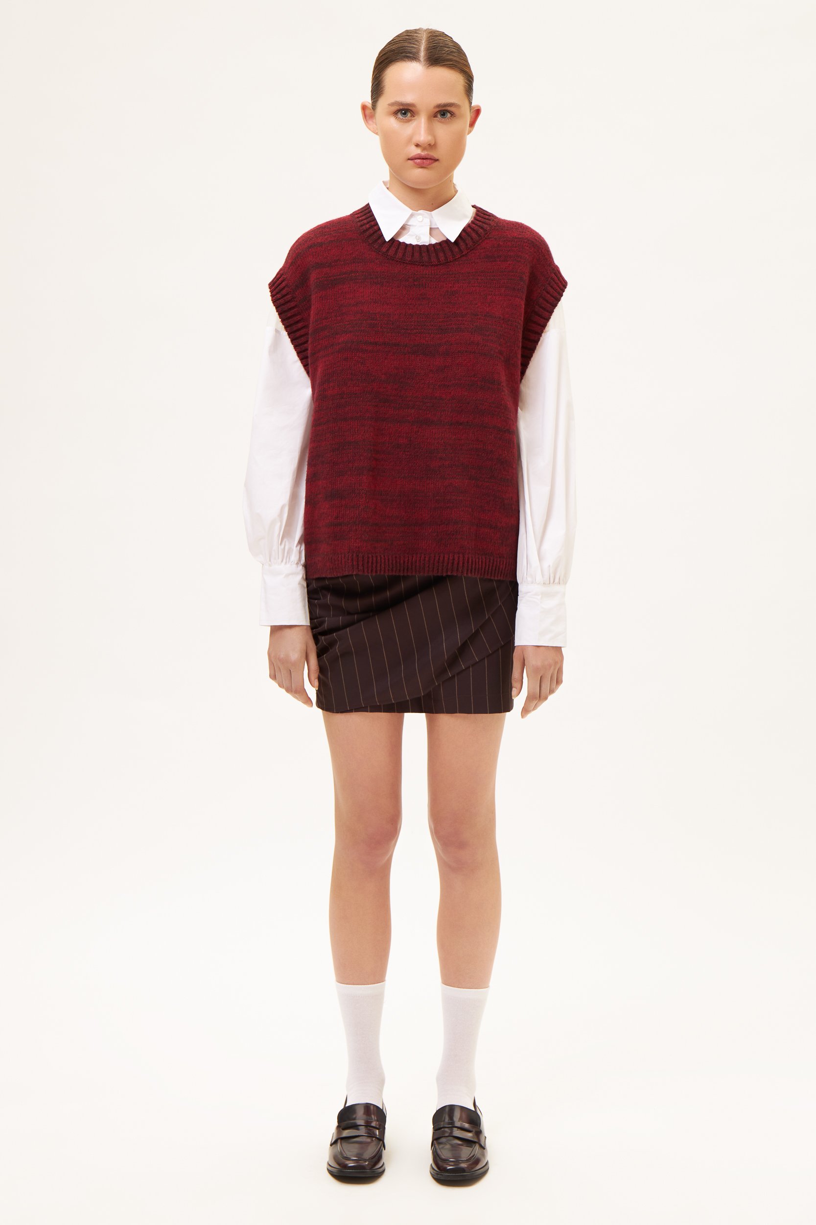 Sleeveless melange sweater vest, with a solid crew neck, crafted from a soft wool and viscose blend yarn. Available in two colors, blue and bordeaux, it features a normal length and loose fit, making it perfect for warm layering.