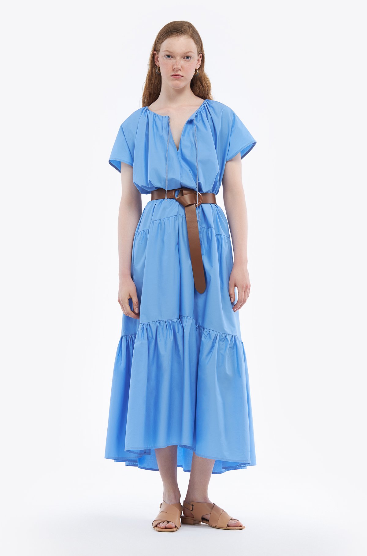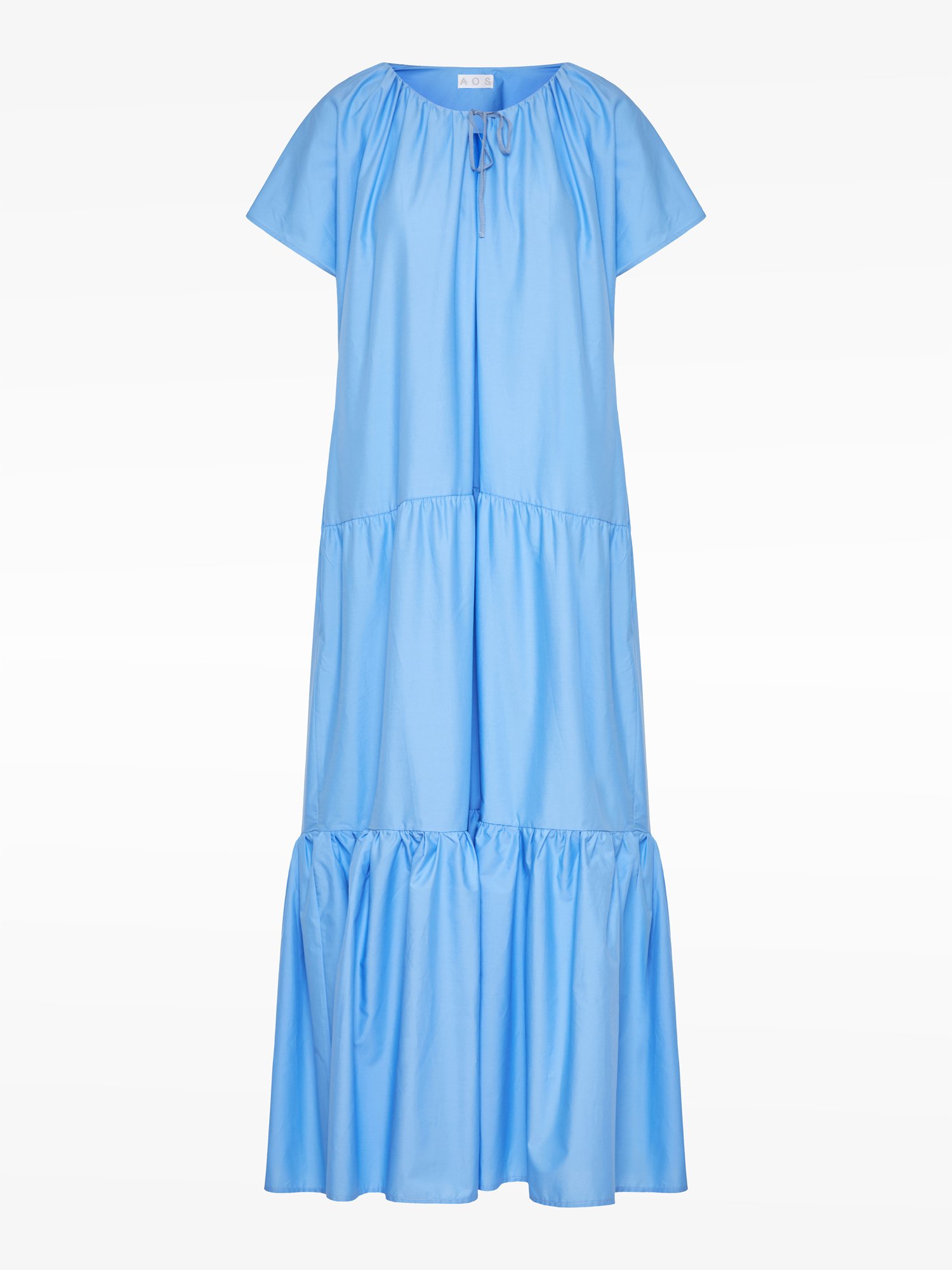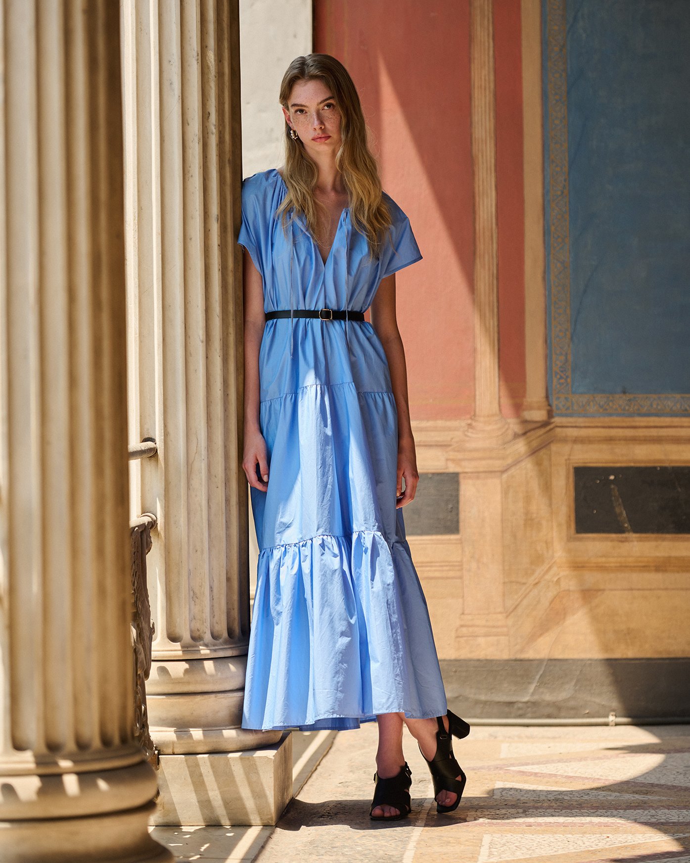 This tiered maxi dress is characterized by the ribbon tying detail in the neckline that gives the option of a deeper décolleté. Style it with sandals for the optimum casual elegant outfit or tie the waist with our black or brown belts.