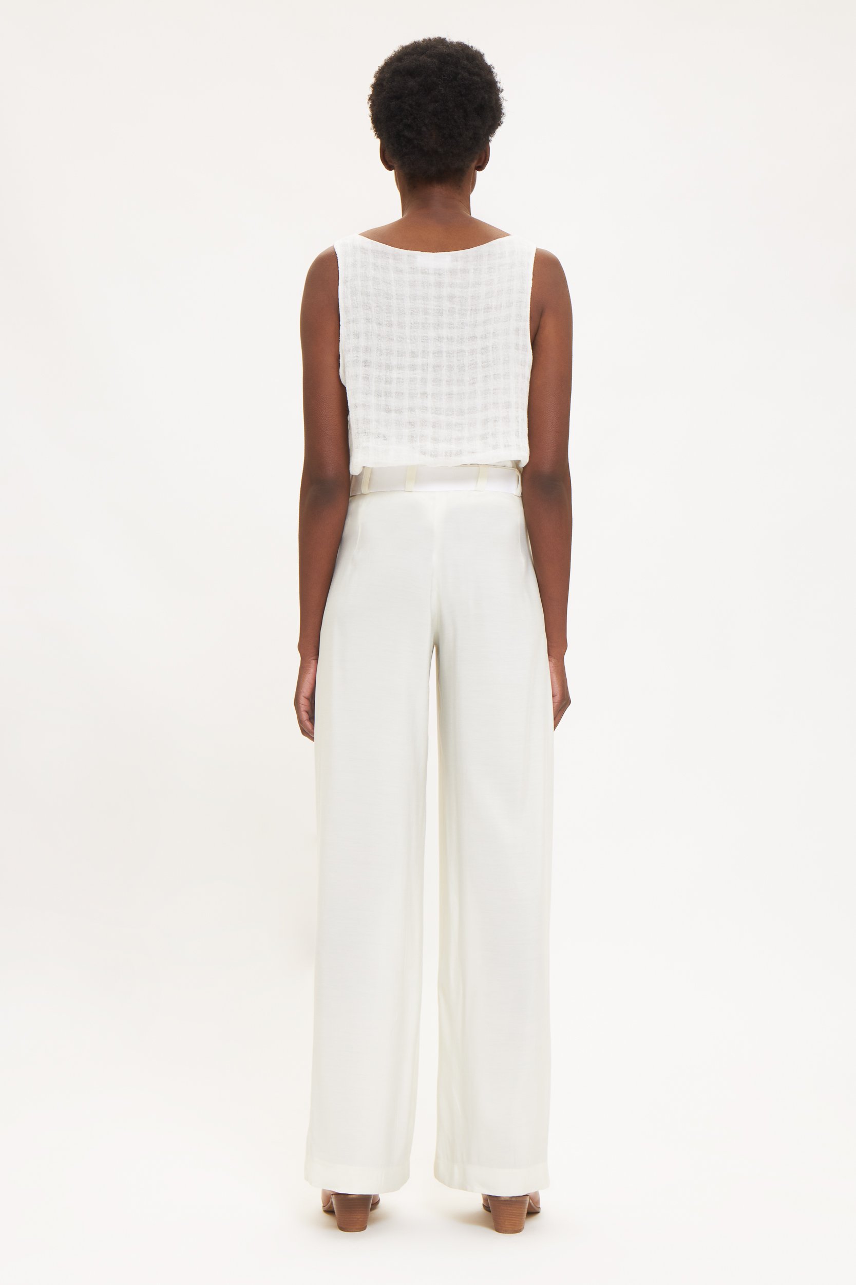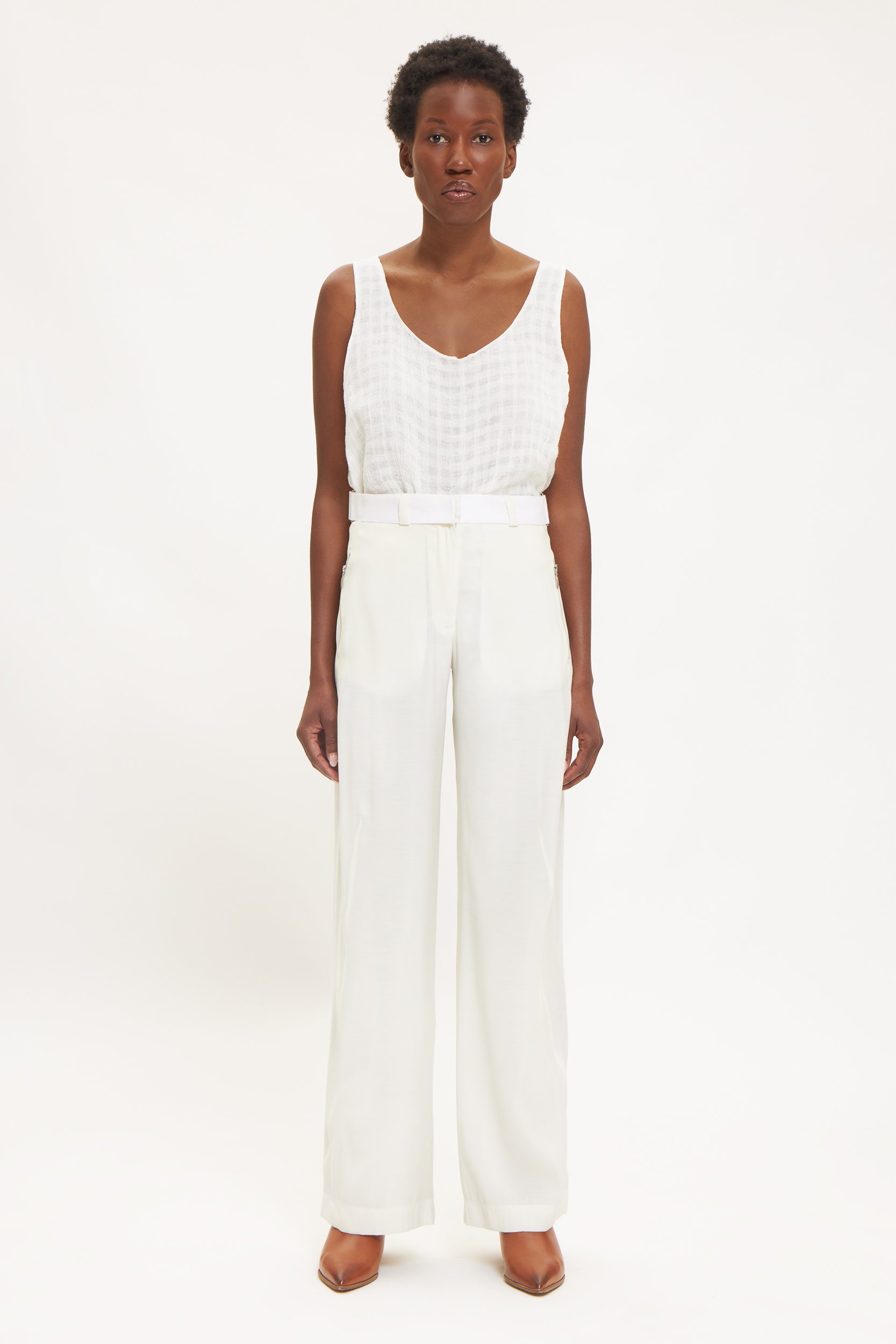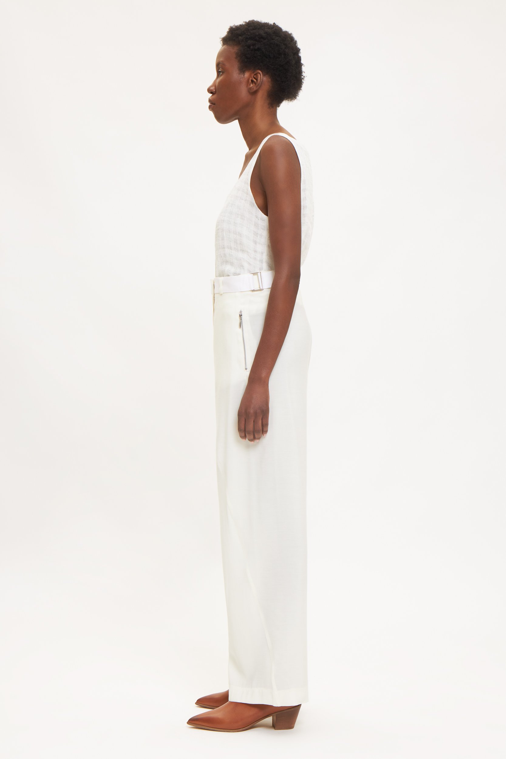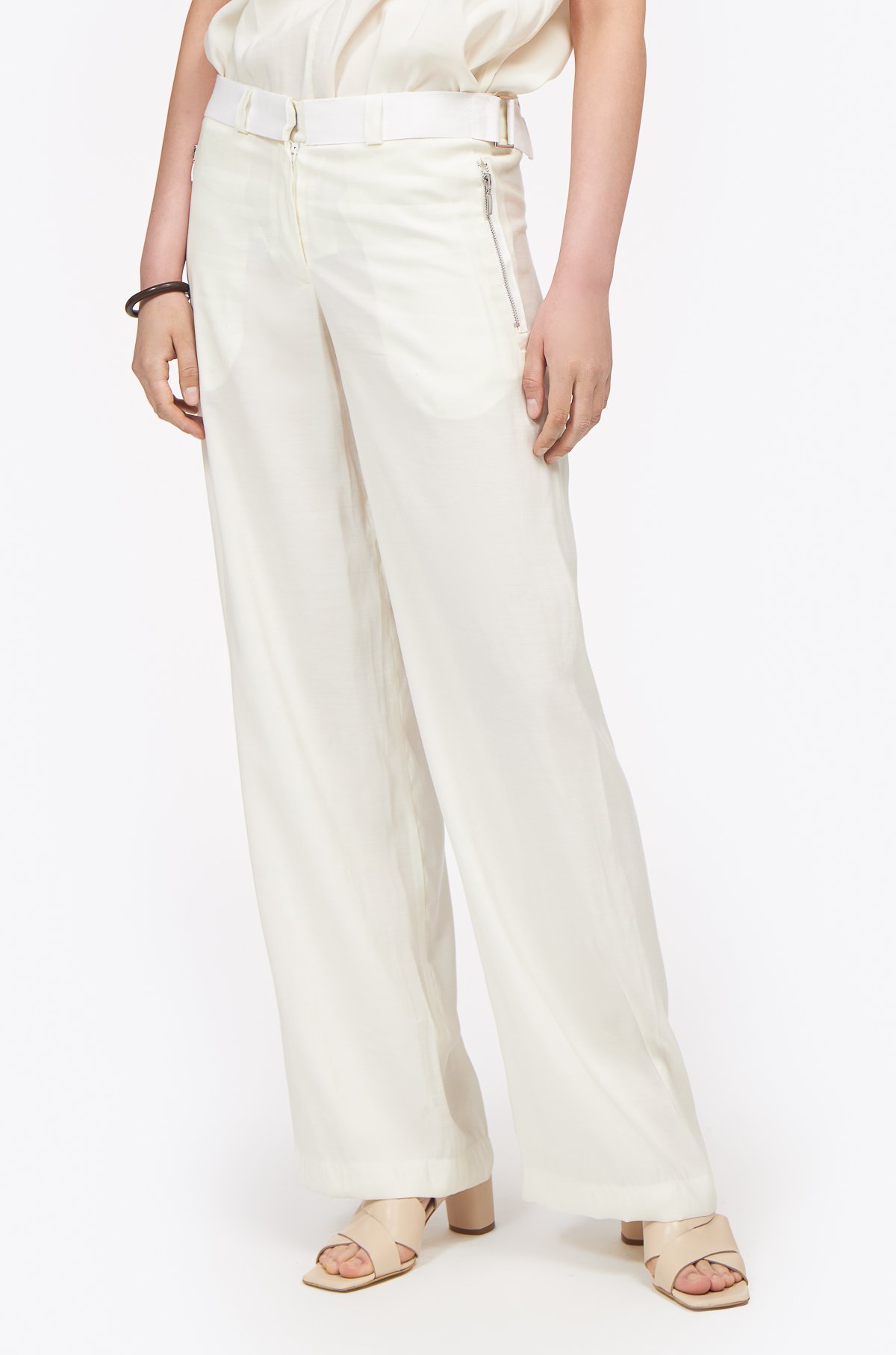 Sleek summer pants, designed with functionality and style in mind. Feature concealed side pockets with zipper fastenings. The belted waist adds a touch of refinement, ensuring both comfort and elegance. Whether paired with a tailored shirt for a polished look or a casual tee for a relaxed vibe, these pants are the perfect blend of practicality and sophistication for any occasion. Model is 1,74 cm tall and wearing a size EU S